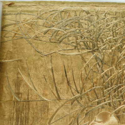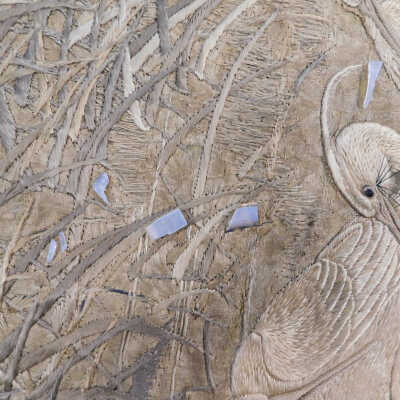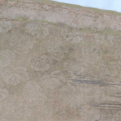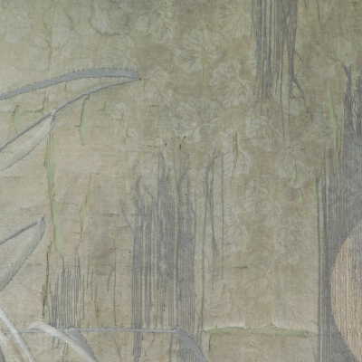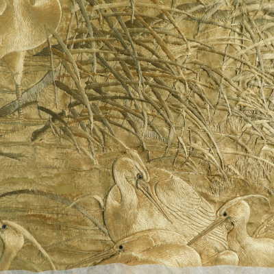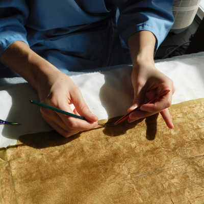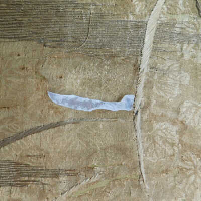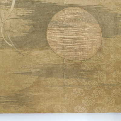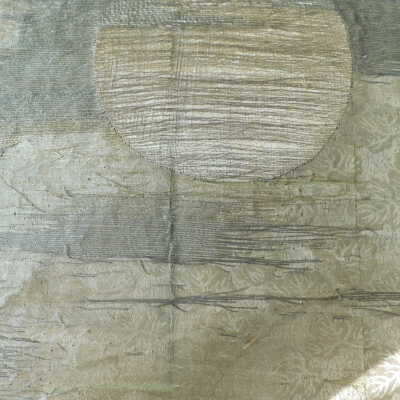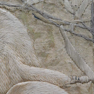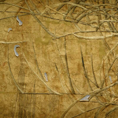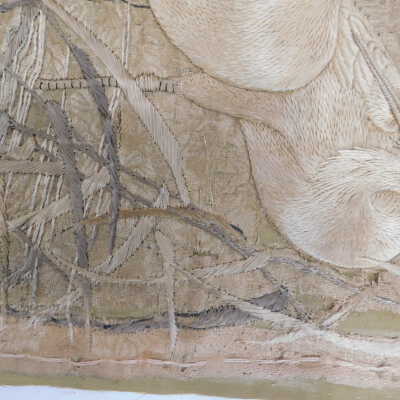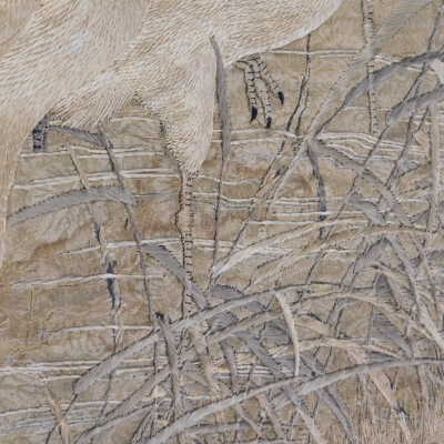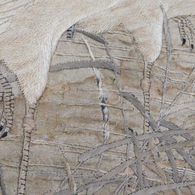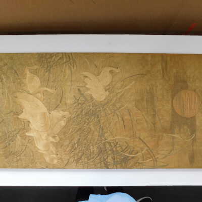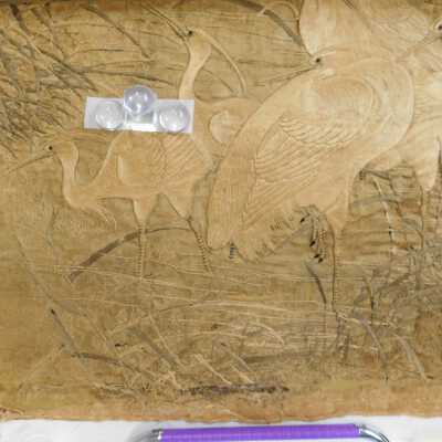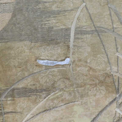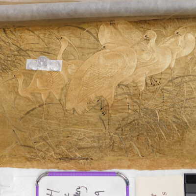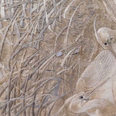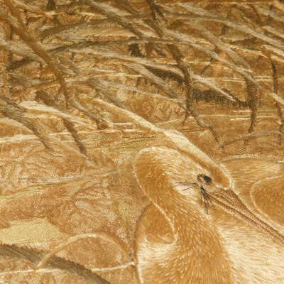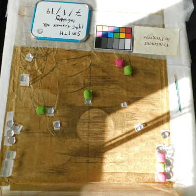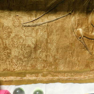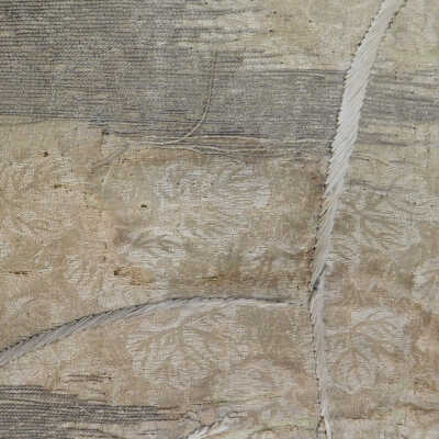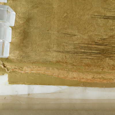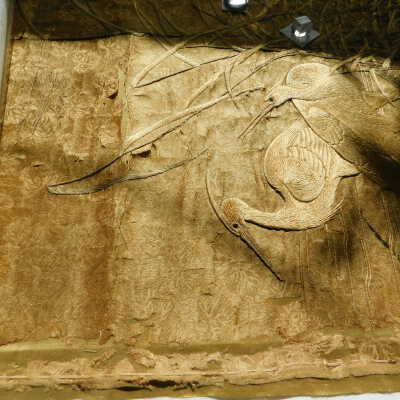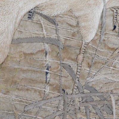 Stitched in backward-looping stitch through all layers: crepeline, textile, silk lining, and cotton muslin lining. Sewed down silk and crepeline to muslin cloth and sewed cranes (needle and thread breaking silk fibers). Decided to elevate textile above table to reduce stress. Used methylcellulose to consolidate background as well as spray fixative.Acute Treatment