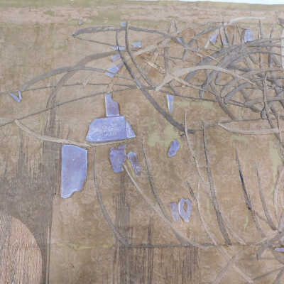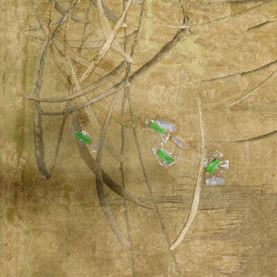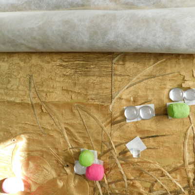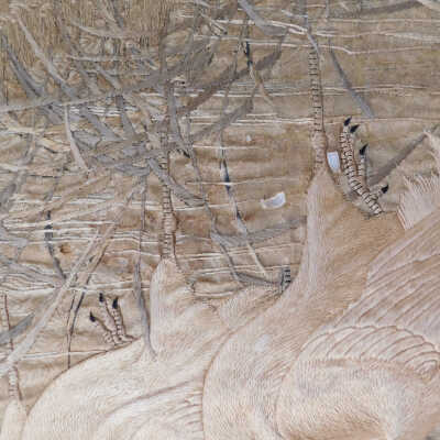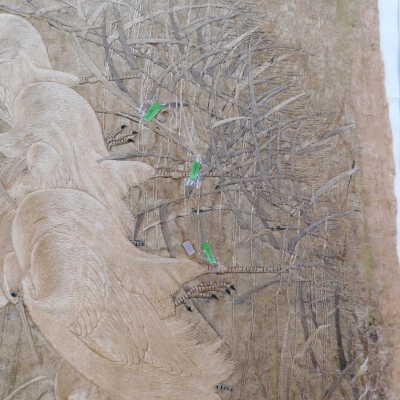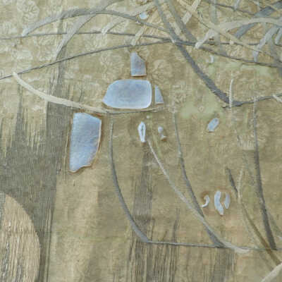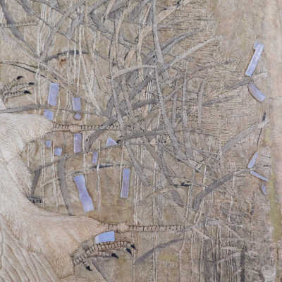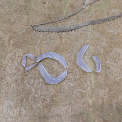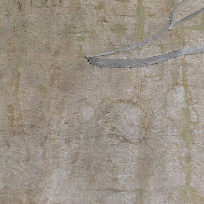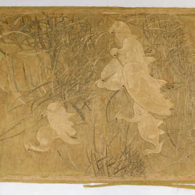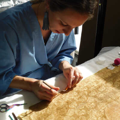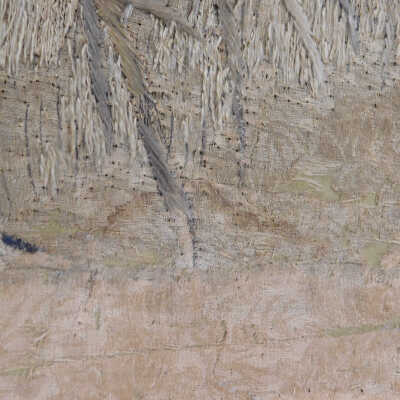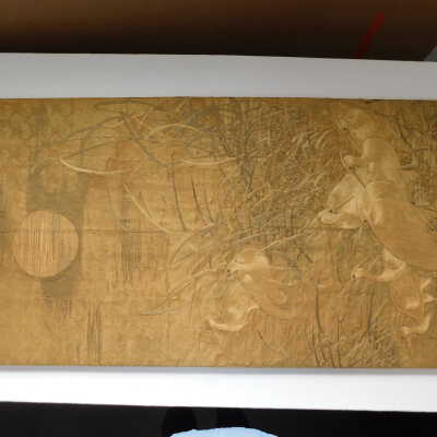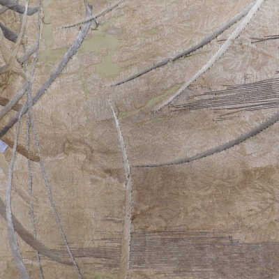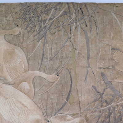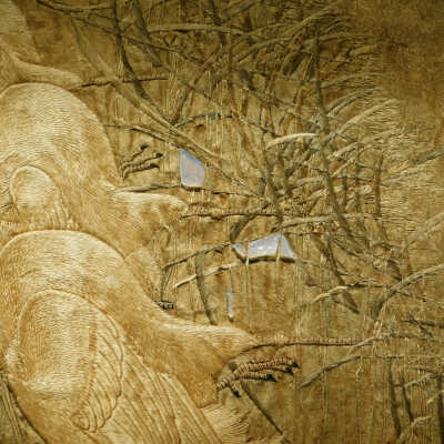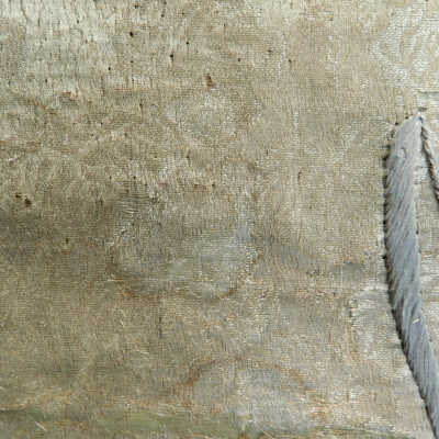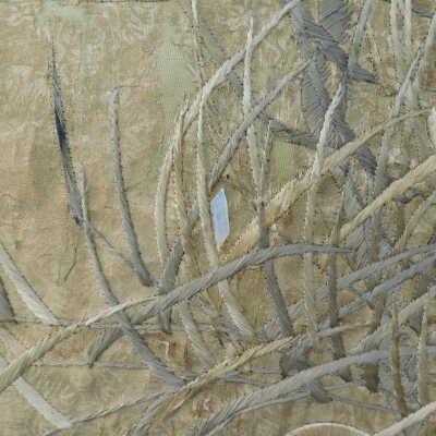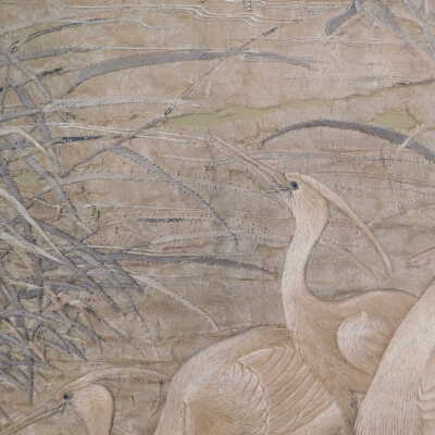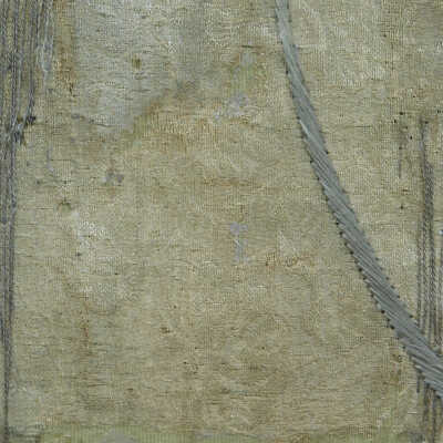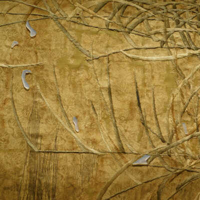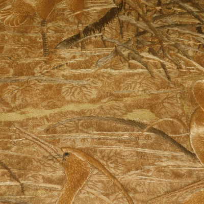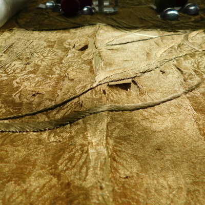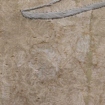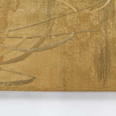 Stitched in backward-looping stitch through all layers: crepeline, textile, silk lining, and cotton muslin lining. Sewed down silk and crepeline to muslin cloth and sewed cranes (needle and thread breaking silk fibers). Decided to elevate textile above table to reduce stress. Used methylcellulose to consolidate background as well as spray fixative.Acute Treatment