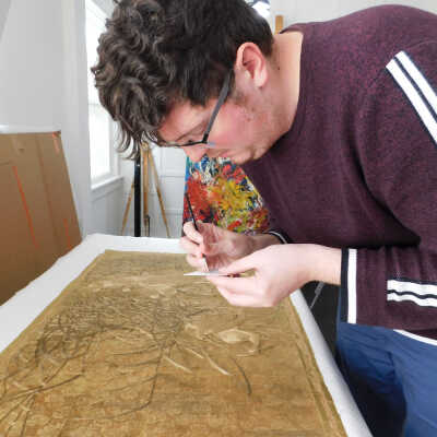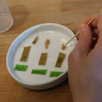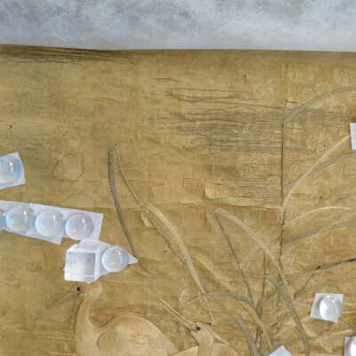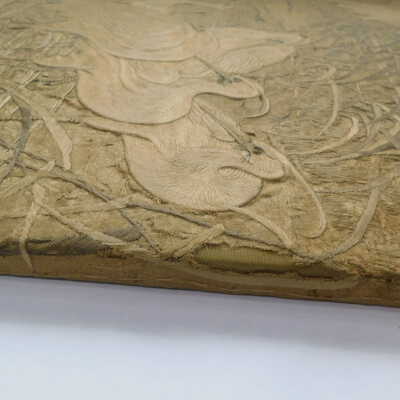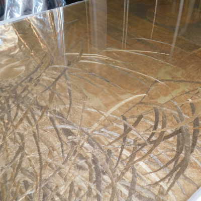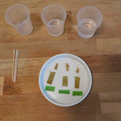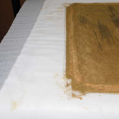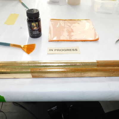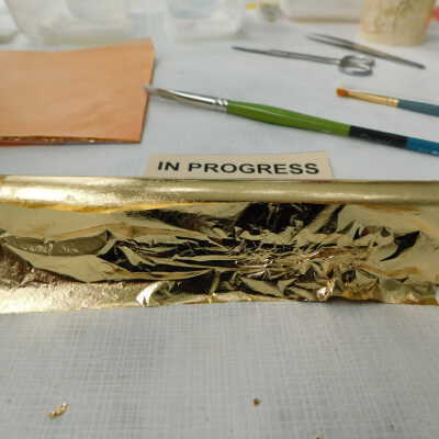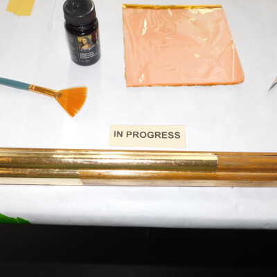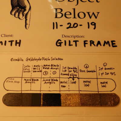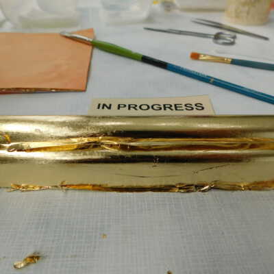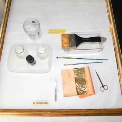 Varnish testing and preparation on metal leave. Varnish: 20 mL. Gamblin Galdehyde Resin, 10 mL Isopropyl Alcohol 90%, 2.5 mL fumed silica.Acute Treatment