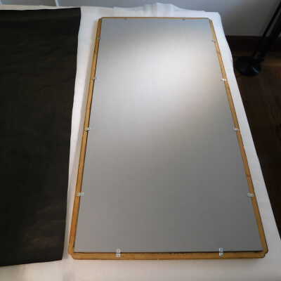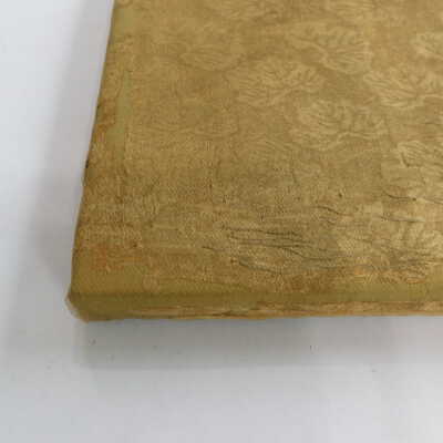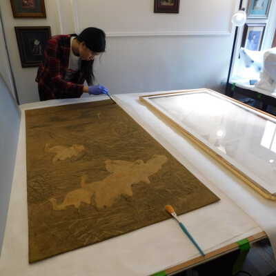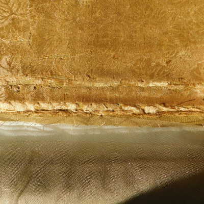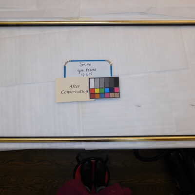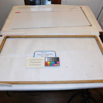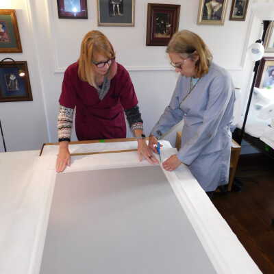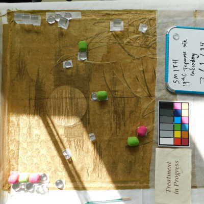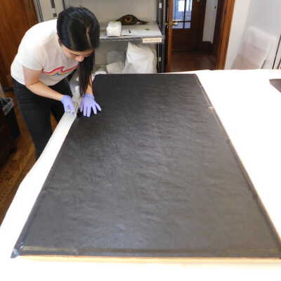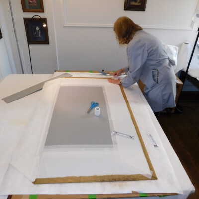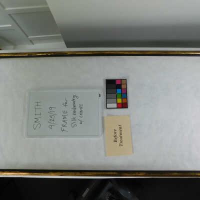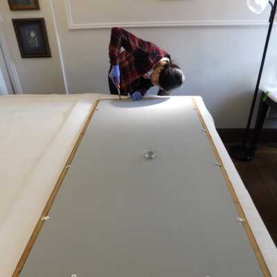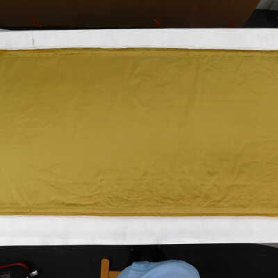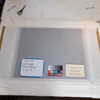 Cut 2 B-flute blue boards, one to mount silk on, one to go behind silk. 3/16" smaller than dims of rabbat: 51 ⅞" x 25 15/16" Trimmed crepeline slightly outside edge of silk. Lint rolled, then vacuumed cotton lining. Mounted silk to blue board with Remay Tape.Acute Treatment