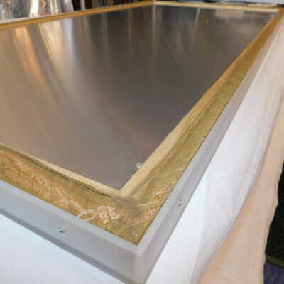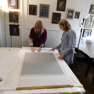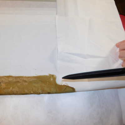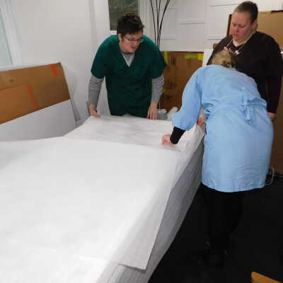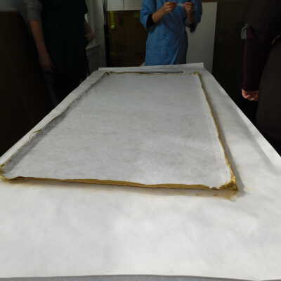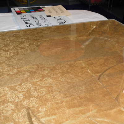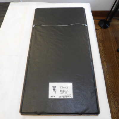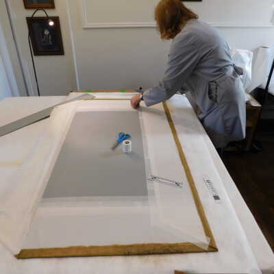 Five people held sandwich of ethafoam/tyvek/cardboard to flip it face up.Batting cut away and running stitch holding package together cut from the back to remove batting, but left in place to hold crepeline. Cut and positioned new lining fabric.Acute Treatment