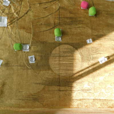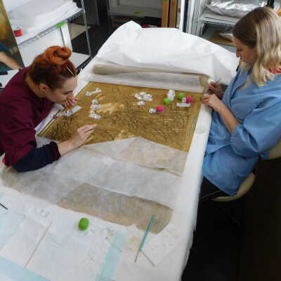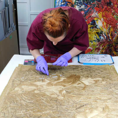 Consolidation with 1:1 methalcellulose and Klucel G in isopropyl alcohol. Additional cleaning of tidelines interspersed. Consolidated threads in moon/cloud region.Acute Treatment