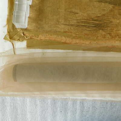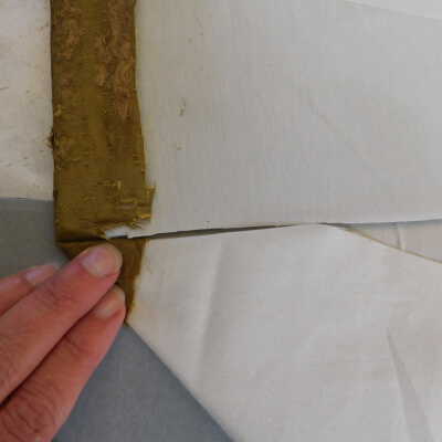 Preparation of 4:1 Agarose gel with 1% Triton-X, vulpex, and tergitol, applied in 3 areas as tests for cleaning tide lines on silk. Continuation of agarose gels used for cleaning (2% triton-x in 4% solution). Gels removed and replaced with new gels of the same formula, with no signs of change. 6% agarose rigid gel with 2% surfactant (Triton-X 100) applied on tidelines. Left 1 hours with soft weight and 7 hours without weight. Prepared 5.5% agarose gel with 2% Triton-X 100. Applied gels to tidelines.Acute Treatment