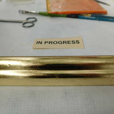 Painted frame fillet black. Masked edge with post-it note. Mixed 2 drops flow improver with mars black golden acrylic (¼ tsp). Brushed on frame. Removed mask, cleaned up edge with slightly damp brush. Completed painting fillet.Acute Treatment