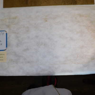 Removing tidelines - using sandwich of silicone release, blotting paper, and pellon. One sandwich on top and one underneath. A light weight was positioned to allow an even and consistent pressure. Demineralized water was used to remove tideline.Acute Treatment