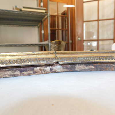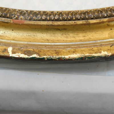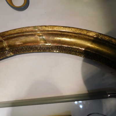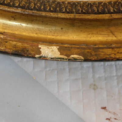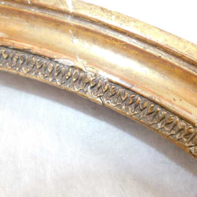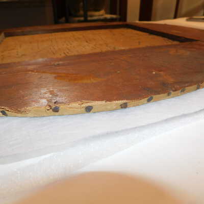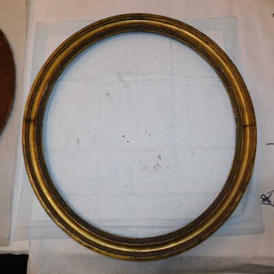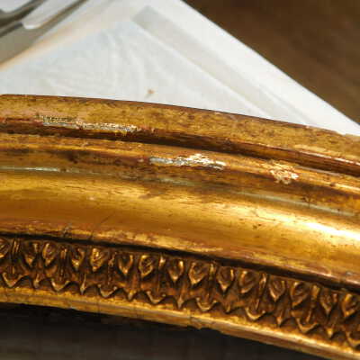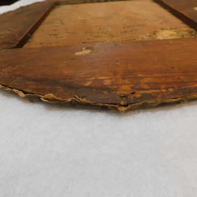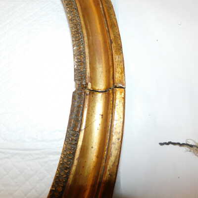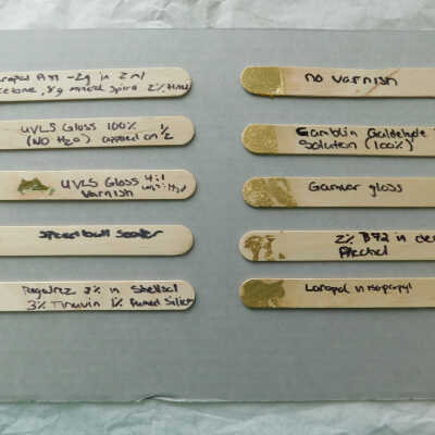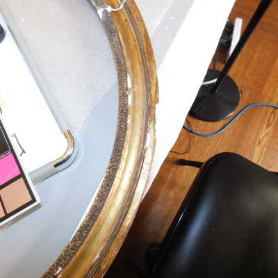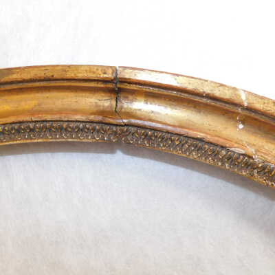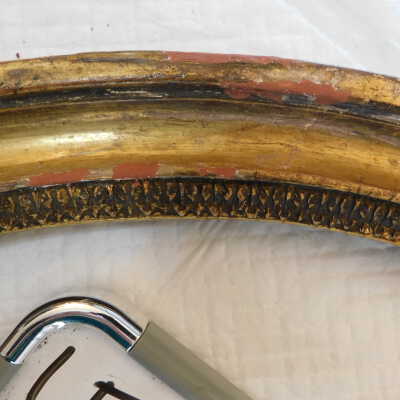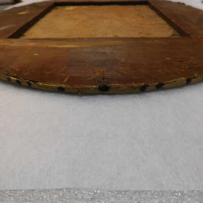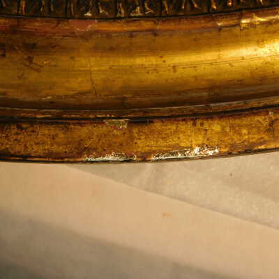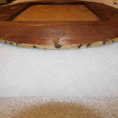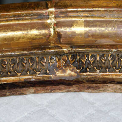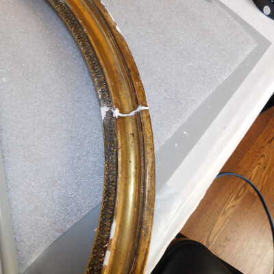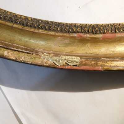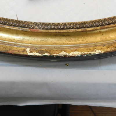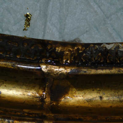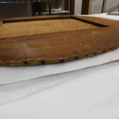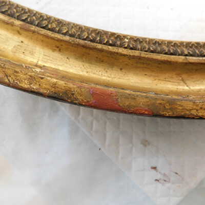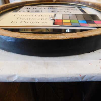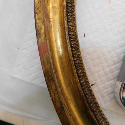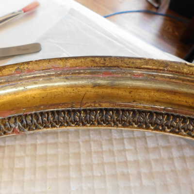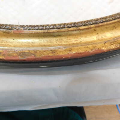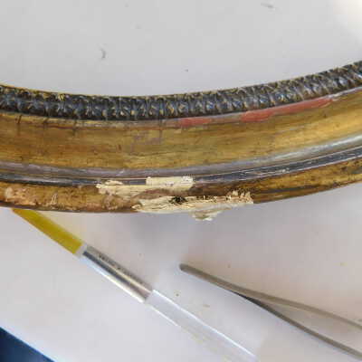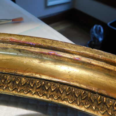 Tested small area with red clay bole. Building tests on spare wood piece. Bole with van dyke brown acrylic worked best to match bole on frame. Tested antiquing method on gold leaf.Acute Treatment