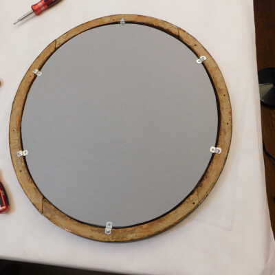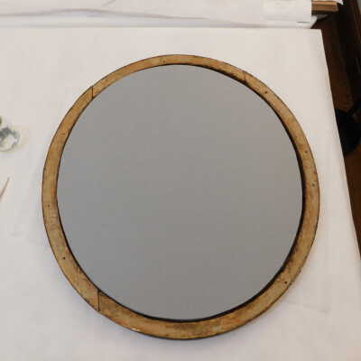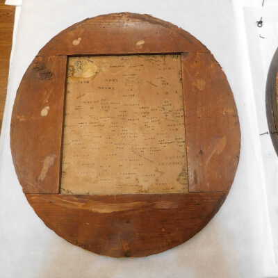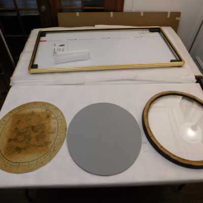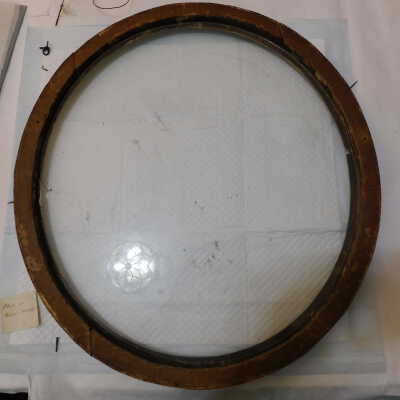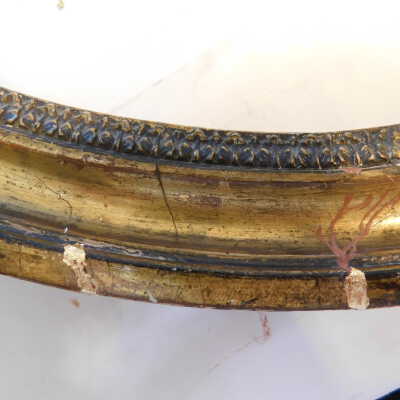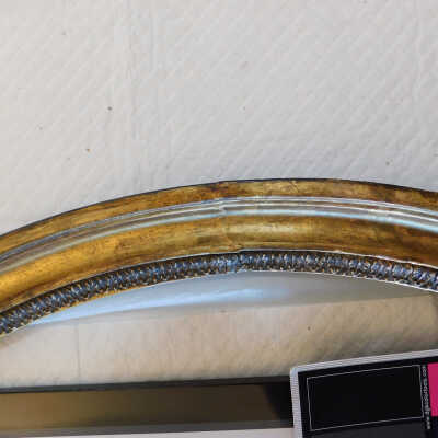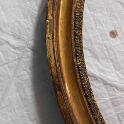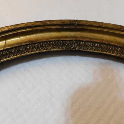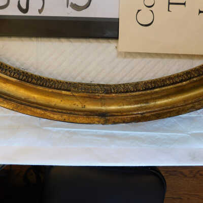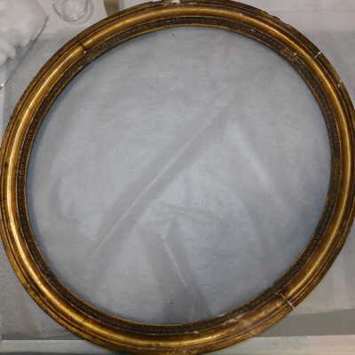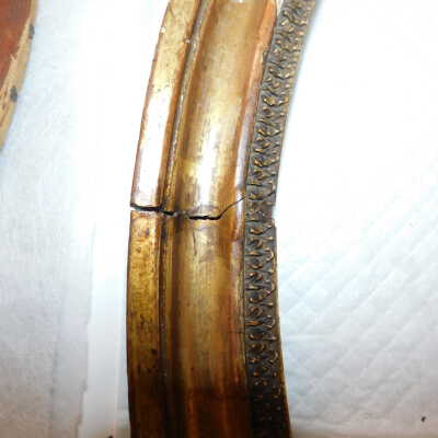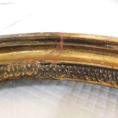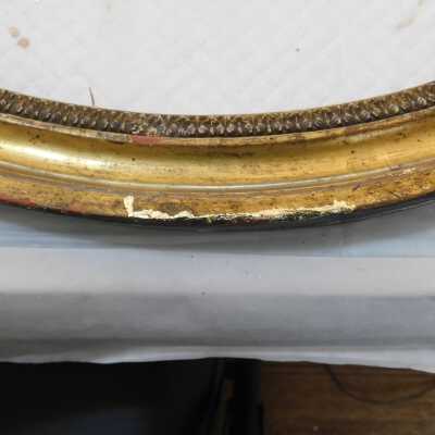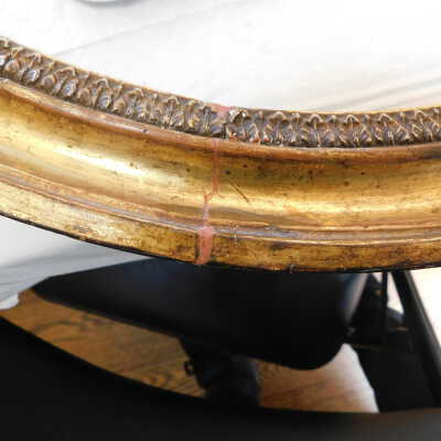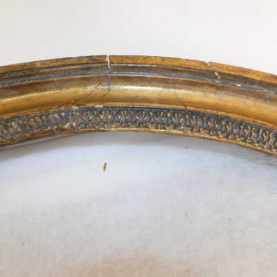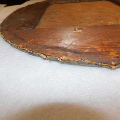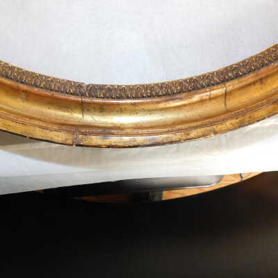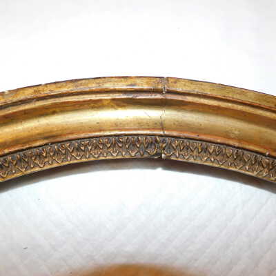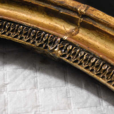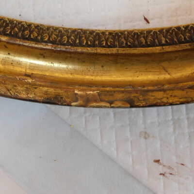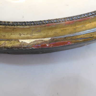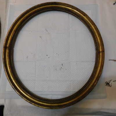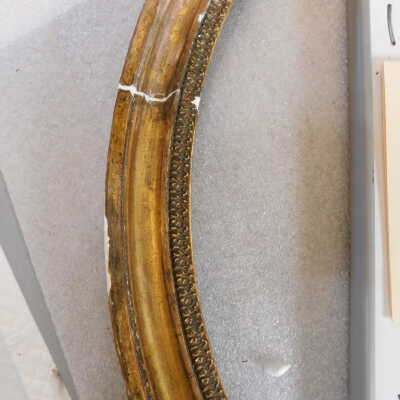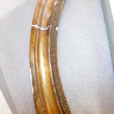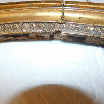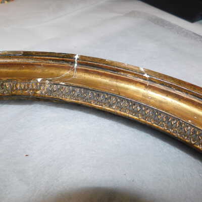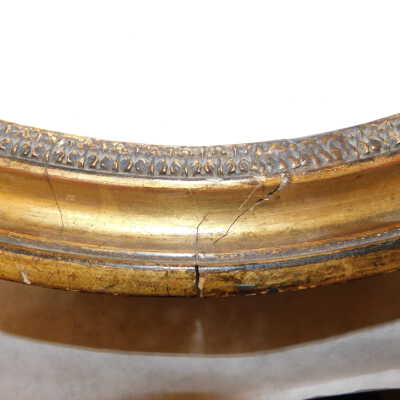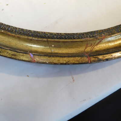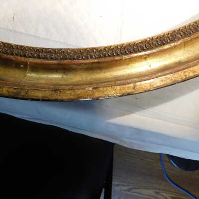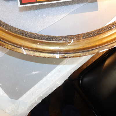 Tested small area with red clay bole. Building tests on spare wood piece. Bole with van dyke brown acrylic worked best to match bole on frame. Tested antiquing method on gold leaf.Acute Treatment