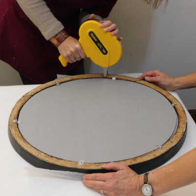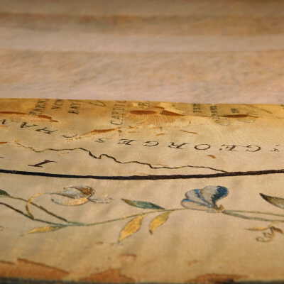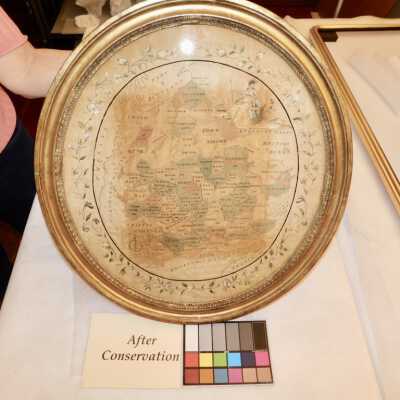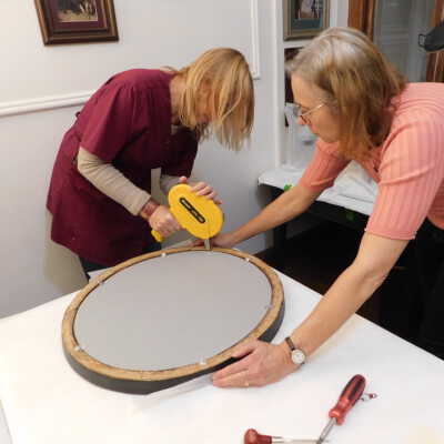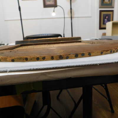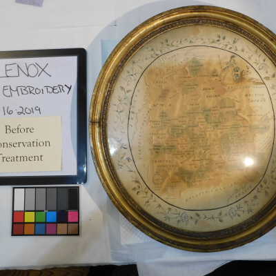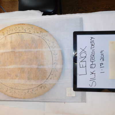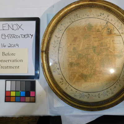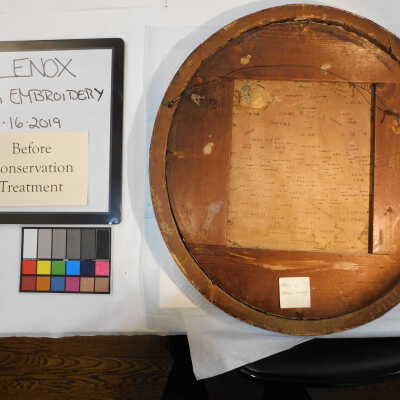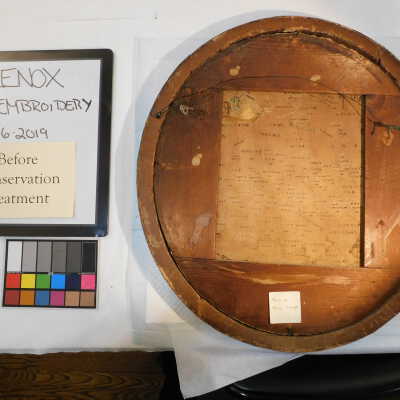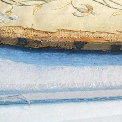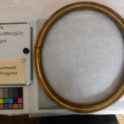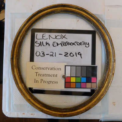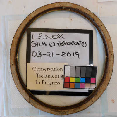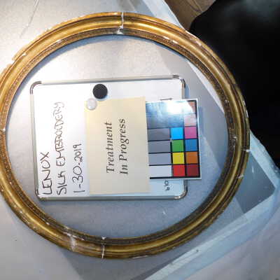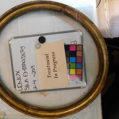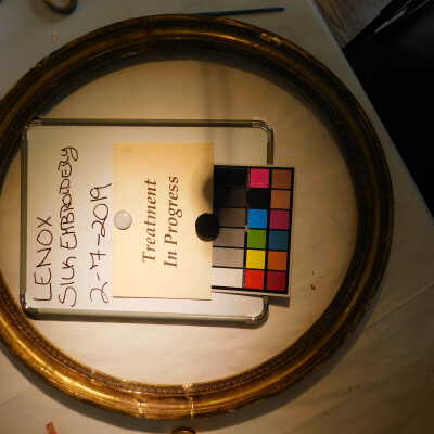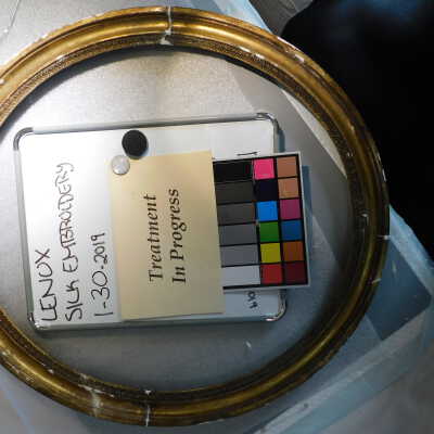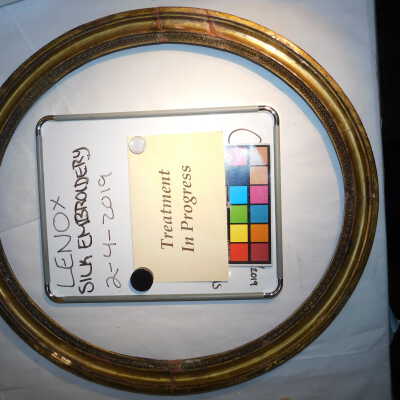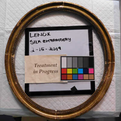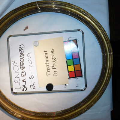 Removed strainer and silk from frame. Took photos. Removed embroidery from wood strainers.Acute Treatment