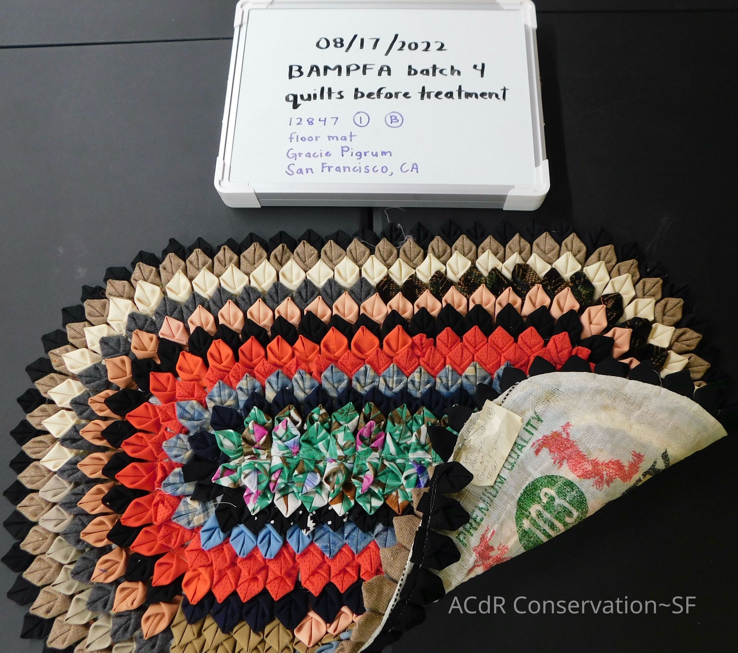 Multi-color, overlapping quilted pieces lined with rice bag