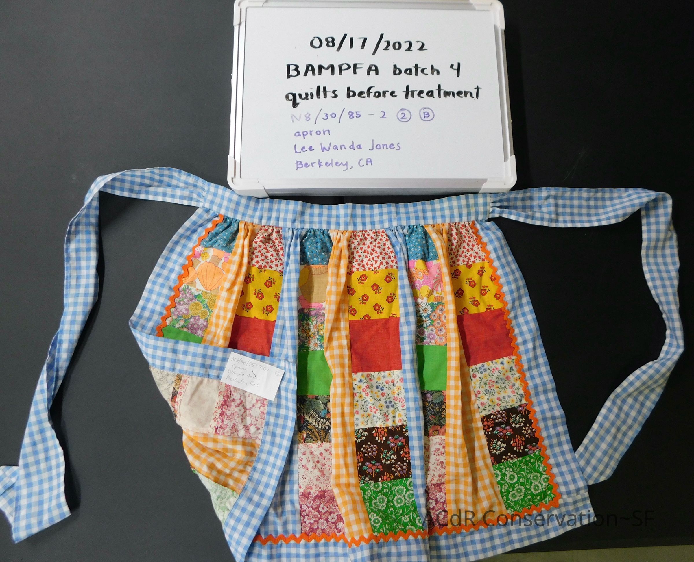 Blue gingham apron with colorful quilted patches