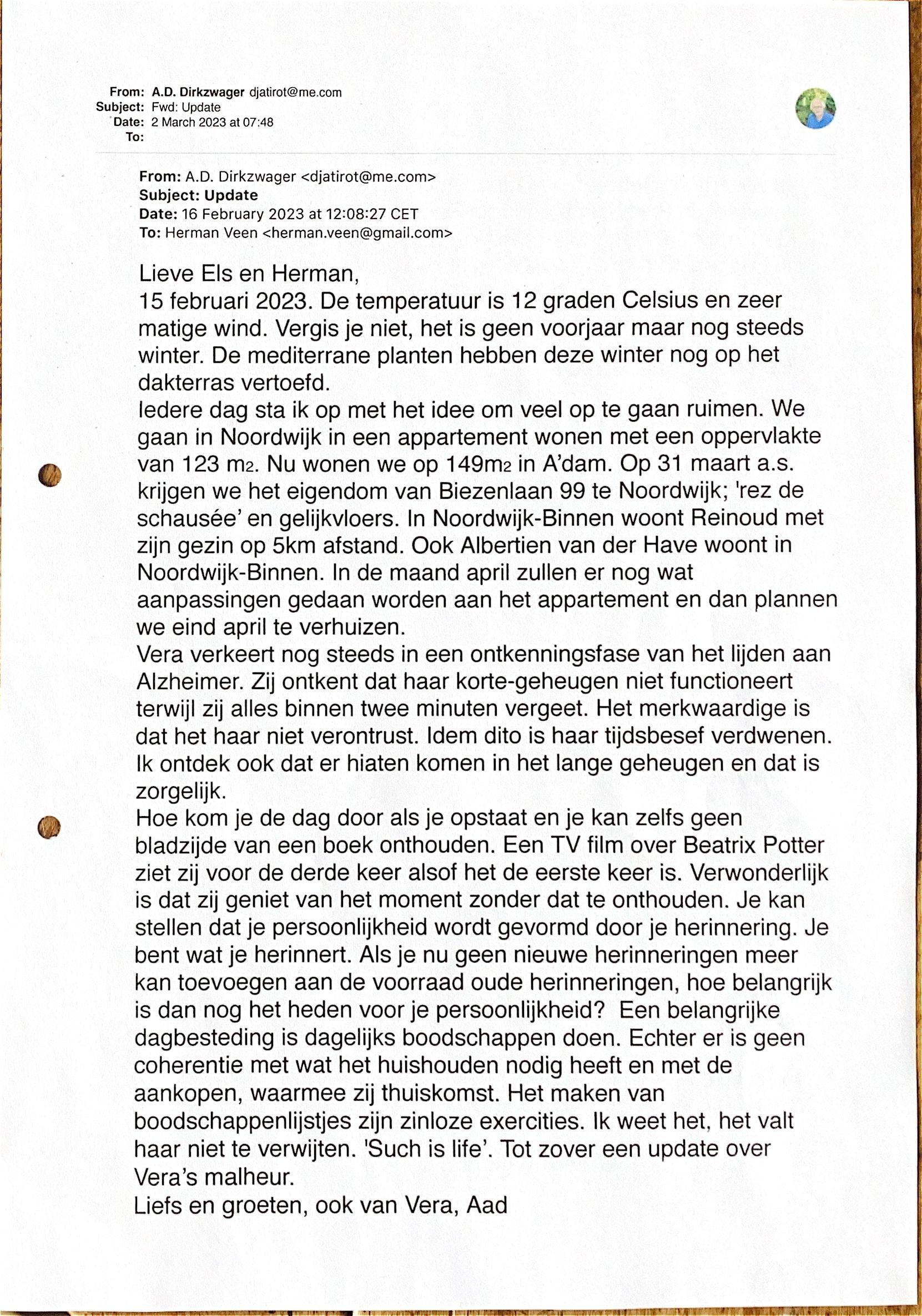 Iedere dag sta ik op met het idee om veel op te gaan ruimen. We gaan in Noordwijk in een appartement wonen met een oppervlakte van 123 m2. Nu wonen we op 149m2 in A’dam. Op 31 maart a.s. krijgen we het eigendom van Biezenlaan 99 te Noordwijk; 'rez de schausée’ en gelijkvloers. In Noordwijk-Binnen woont Reinoud met zijn gezin op 5km afstand. Ook Albertien van der Have woont in Noordwijk-Binnen. In de maand april zullen er nog wat aanpassingen gedaan worden aan het appartement en dan plannen we eind april te verhuizen.
