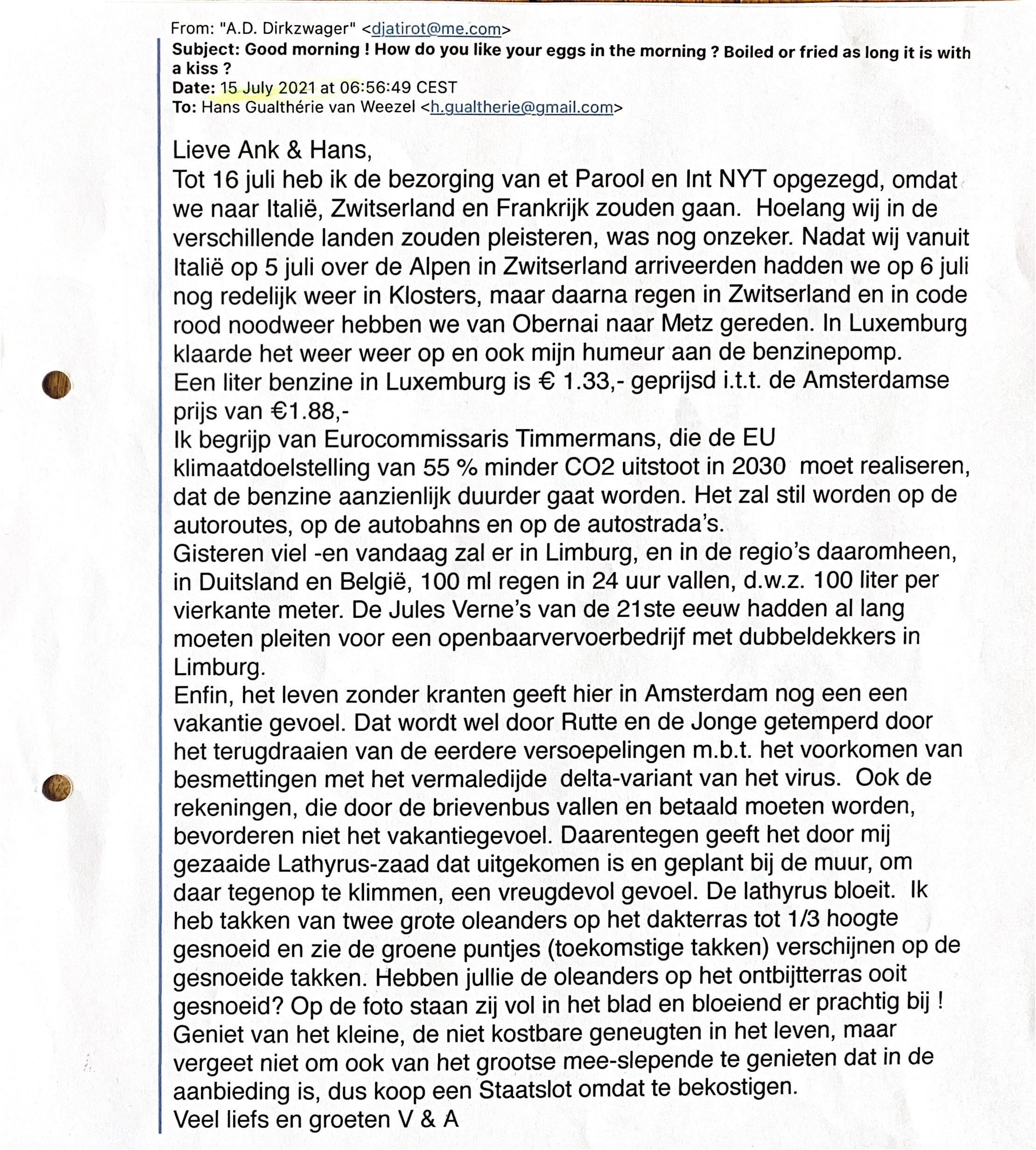 2021-07-15 Brief aan Hans en Ank v. G. v. W. over de terugkeer vauit Italie naar Amsterdam in noodweer.