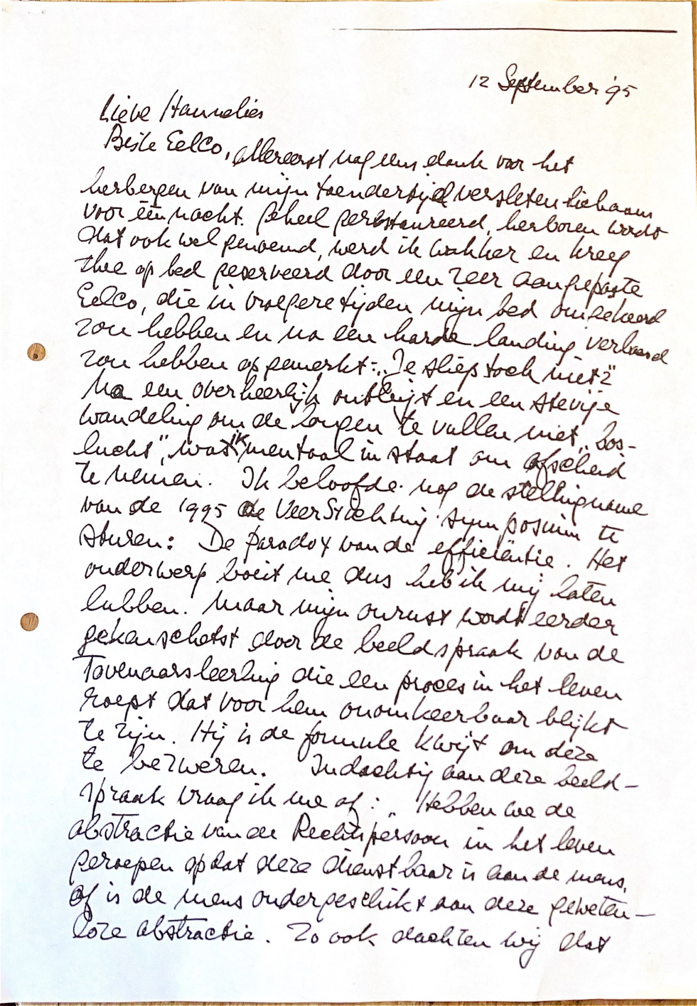 Na een overheerlijk ontbijt en een stevige wandeling om de longen te vullen met "boslucht," was ik mentaal in staat om afscheid te nemen. Ik beloofde nog de stellingname van het "1995 de Veerstichting Symposium" te sturen: "De Paradox van de Efficiëntie." Het onderwerp boeit me, dus heb ik mij laten lubben.