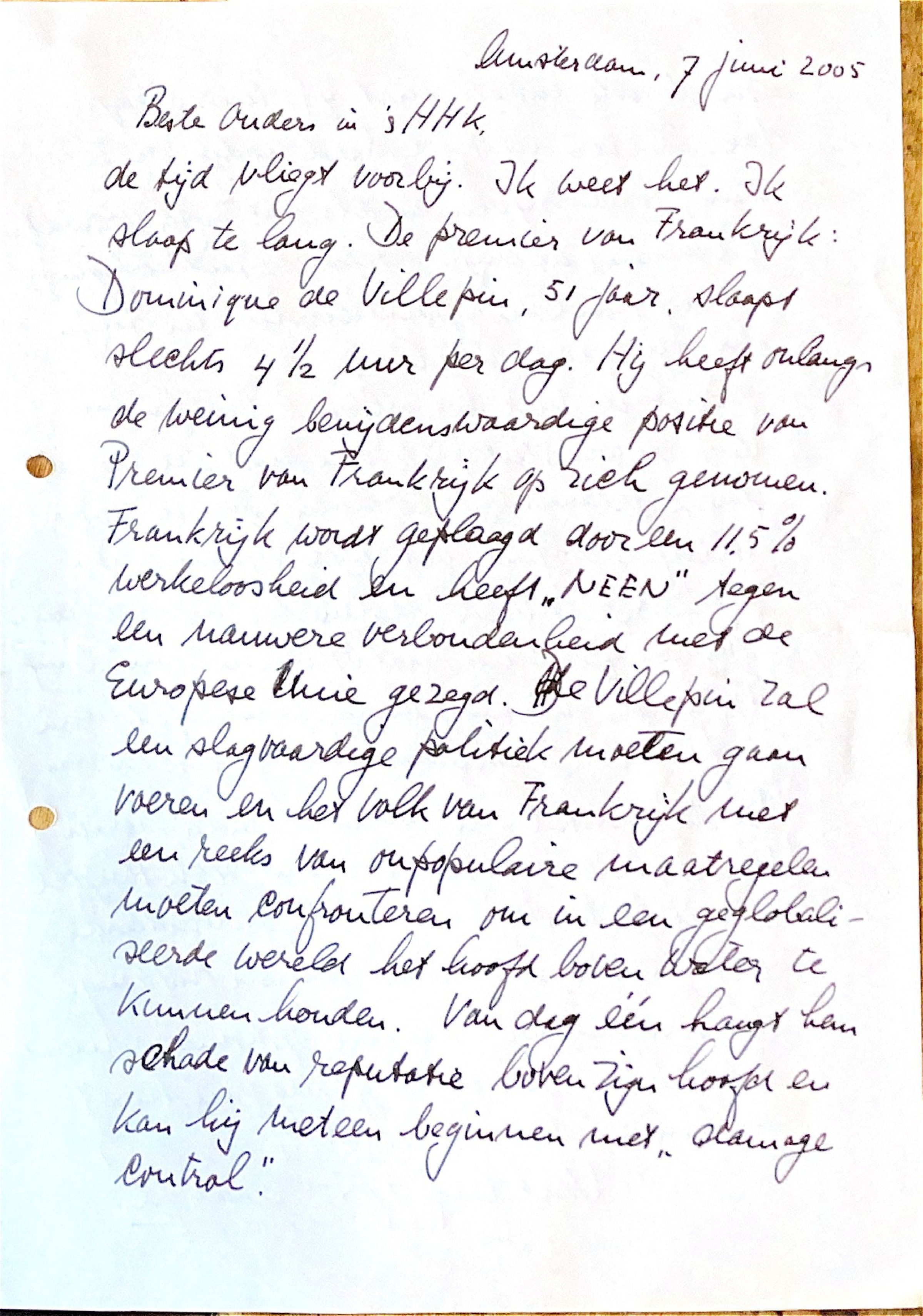 Frankrijk wordt geplaagd door een 11.5 % werkeloosheid en heeft NEEN tegen een nauwere verbondenheid met de Europese Unie gestemd. De Villepin zal een slagvaardige politiek moeten gaan voeren en het volk van Frankrijk met een reeks van onpopulaire maatregelen moeten confronteren om in een geglobaliseerd wereld het hoofd boven water te kunnen houden. Van dag één hangt hem "schade reputatie" boven zijn hoofd en kan hij meteen beginnen met "damage control".