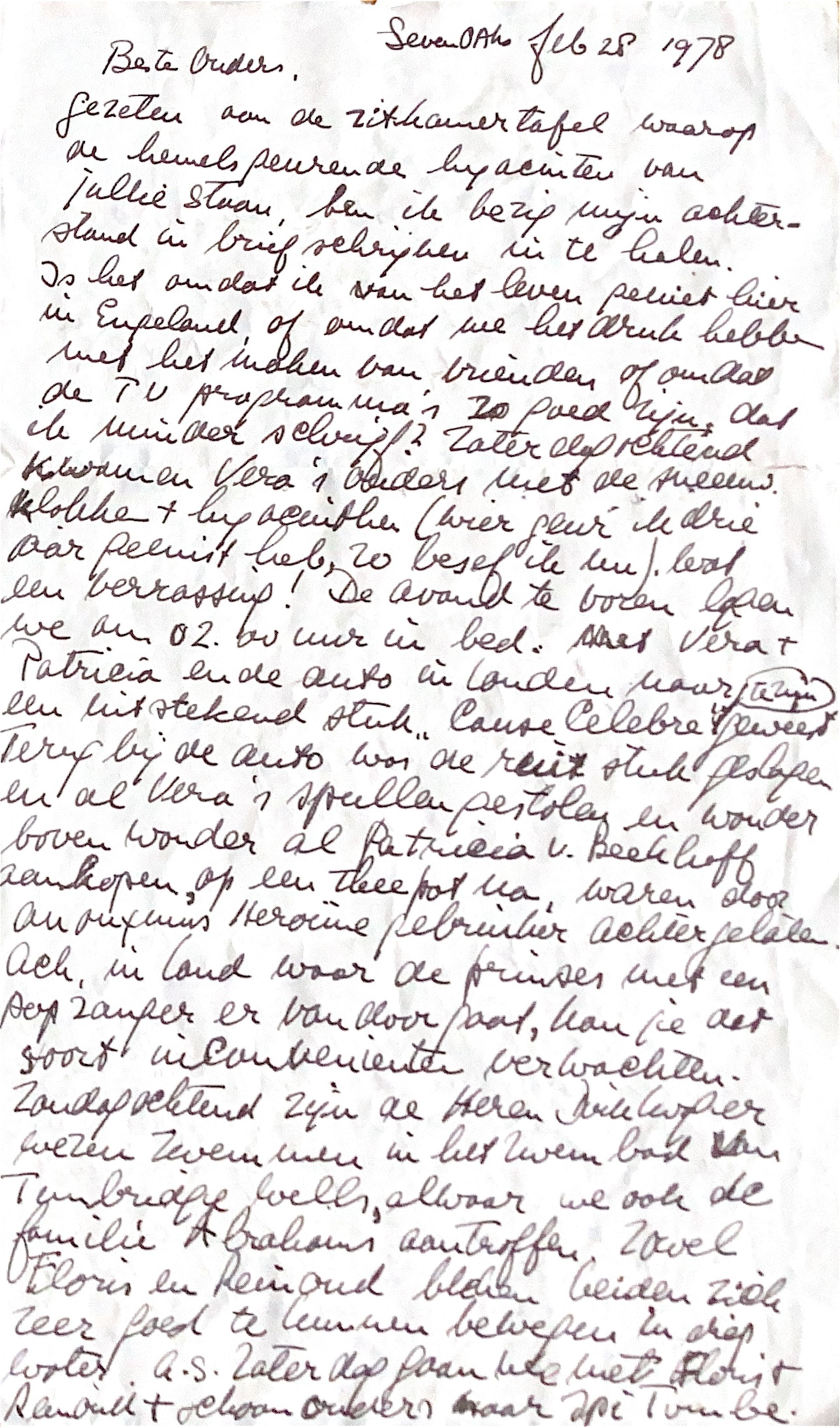 Zaterdagochtend kwamen Vera's ouders met de sneeuwklokken + hyacinten (wier geur ik drie jaar gemist heb, zo besef ik nu). Wat eenn verrassing ! De avond te voren lagen we om 02.00 uur am in bed. Met Vera + Patricia en de auto in Londen naar een uitstekend toneelstuk "Cause Celebre"te zijn geweest. Terug bij de aito was de ruit stuk geslagen en al Vera's spullen gestolen en wonder boven wonder al Patricia v. Beekhoff's aankopen, op eenn theepot na, waren door de anonymous Heroïne gebruiker achtergelaten.