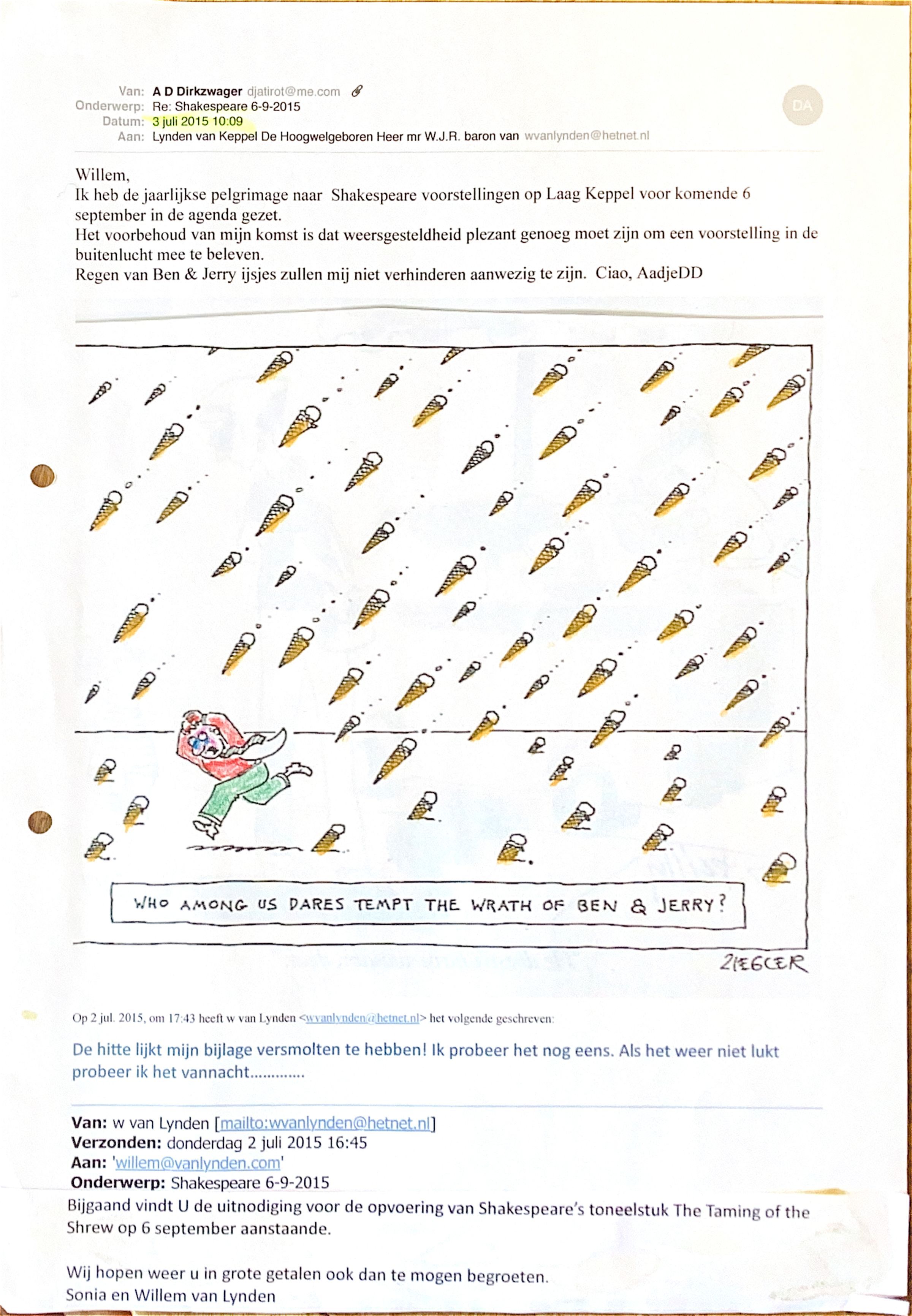 2015-07-03 Mail aan Willem v. Lynden over een uitnodiging v. d. uitvoering van Shakespeares toneelstuk The Taming of the Shrew.