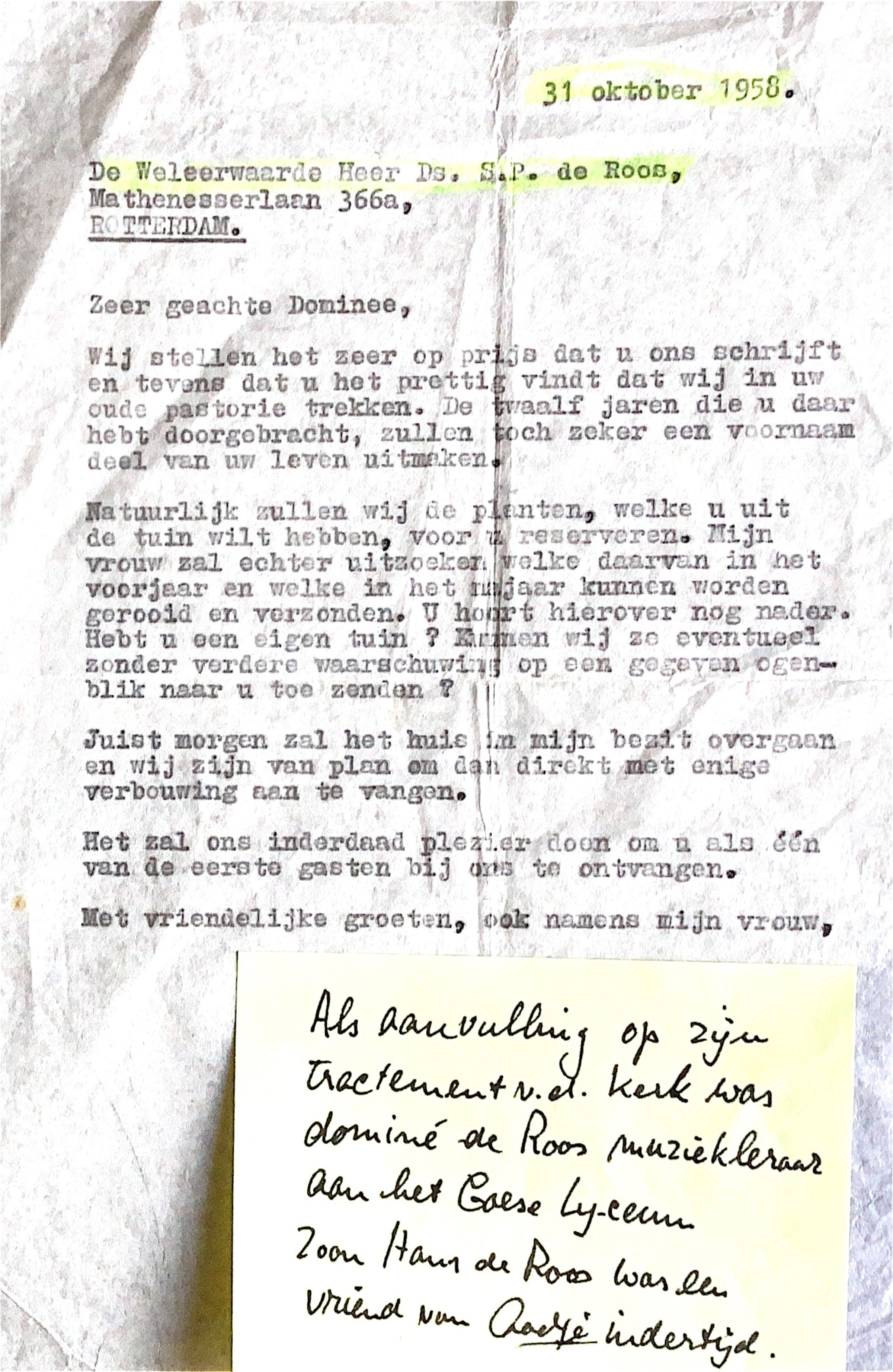 Als aanvulling op uw Tractement v..g. Kerk: was dominee de Roos muziekleraar aan het Goese Lyceum. Zoon Hans de Roos was le Vriend von Cadre indertijd.