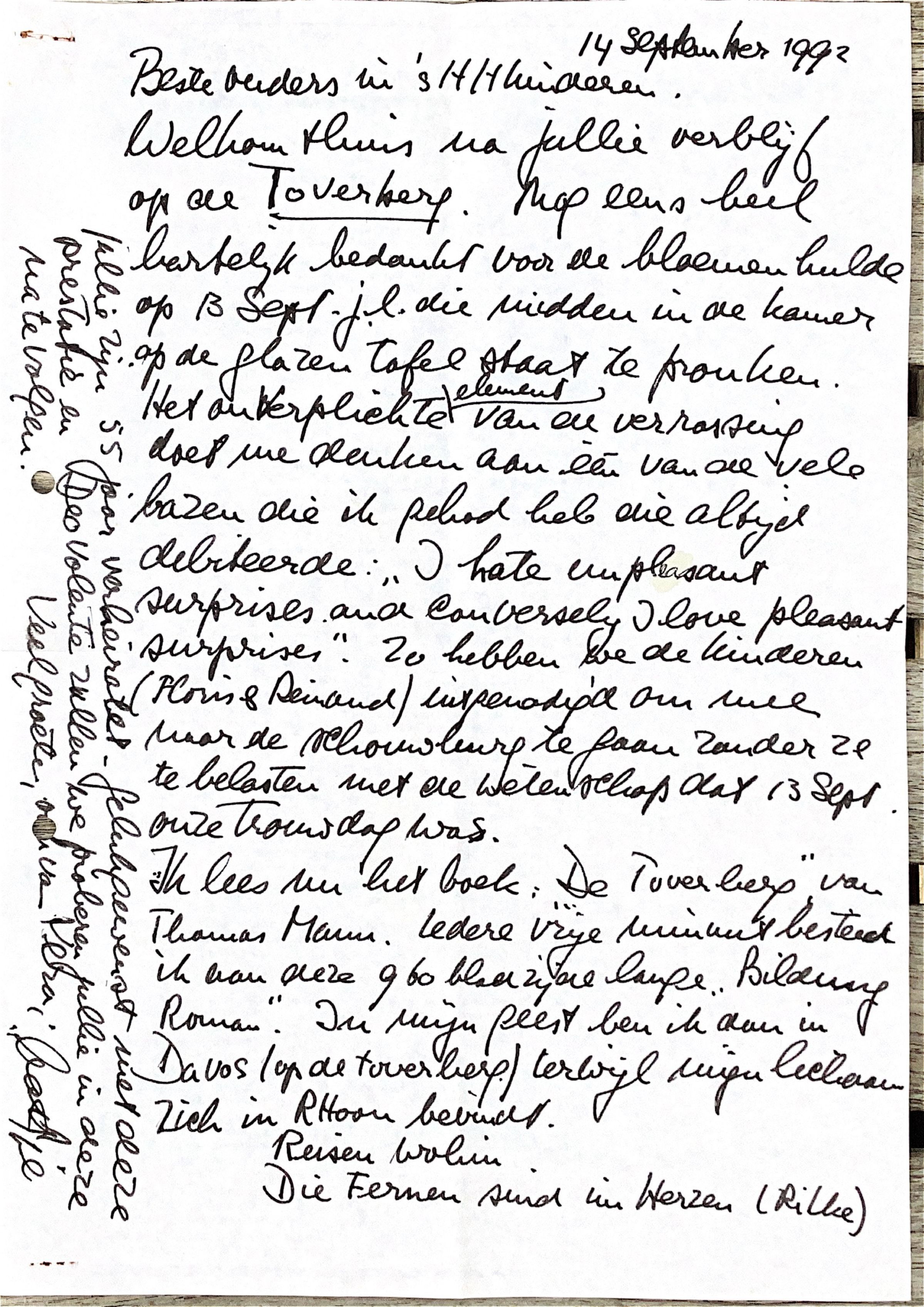 Welkom thuis na jullie verblijf op de `Toverberg. Nog eens heel hartelijk bedankt voor de bloemenhulde op 13 september j.l. die midden in de kamer op de glazen tafel staat te pronken.
