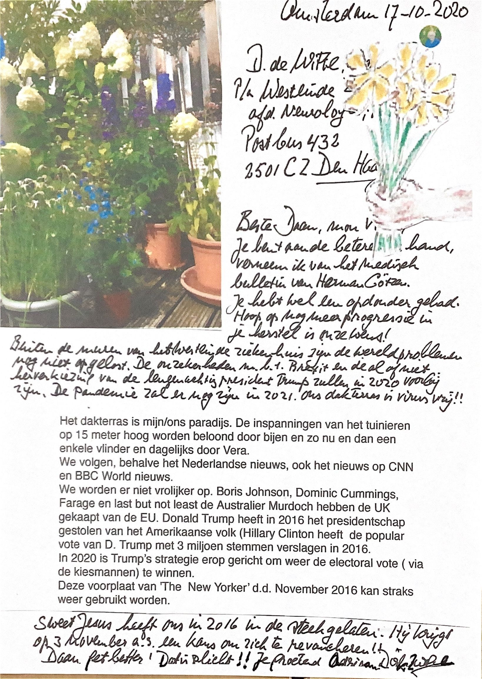 Buiten de muren van het Westeinde ziekenhuis zijn de wereldproblemen nog niet opgelost. De onzekerheden m.b.t. Brexit en de al of niet herverkiezing van de leugenachtige Amerikaanse President Trump zullen in 2020 voorbij zijn. De Pandemie zal er nog zijn in 2021. Ons dakterras is virusvrij !!