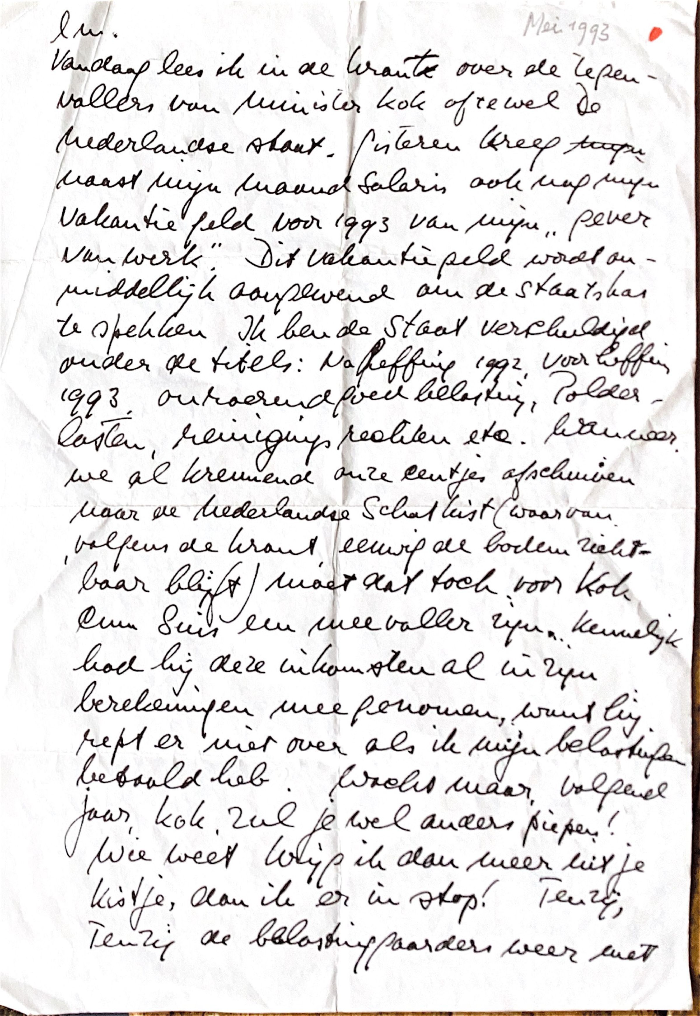 vandaag lees ik in de krant over de tegenvallers van Minister Kok of te wel van de Nederlandse Staat.. Giste van mijn " van werk.gever". Dat vakantiegeld wordt onmiddellijk aangewend om de Staatskas te spekken. Ik ben de Staat verschuldigd onder de titels: Naheffing 1992 en Voorheffing 1993, Onroerendgoed belasting, Polderlasten. Reinigingsrechten etc.
