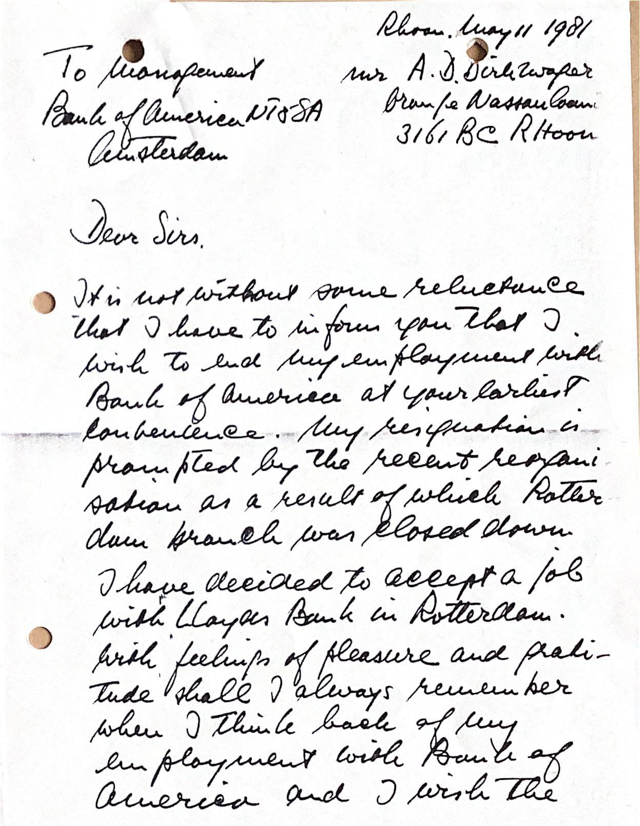 It is not without some reluctance that I have to inform you that I wish to end my employment with Bank of America at your earliest convenience. My resignation is prompted by the recent reorganisation as a result of which Rotterdam branch was closed down.