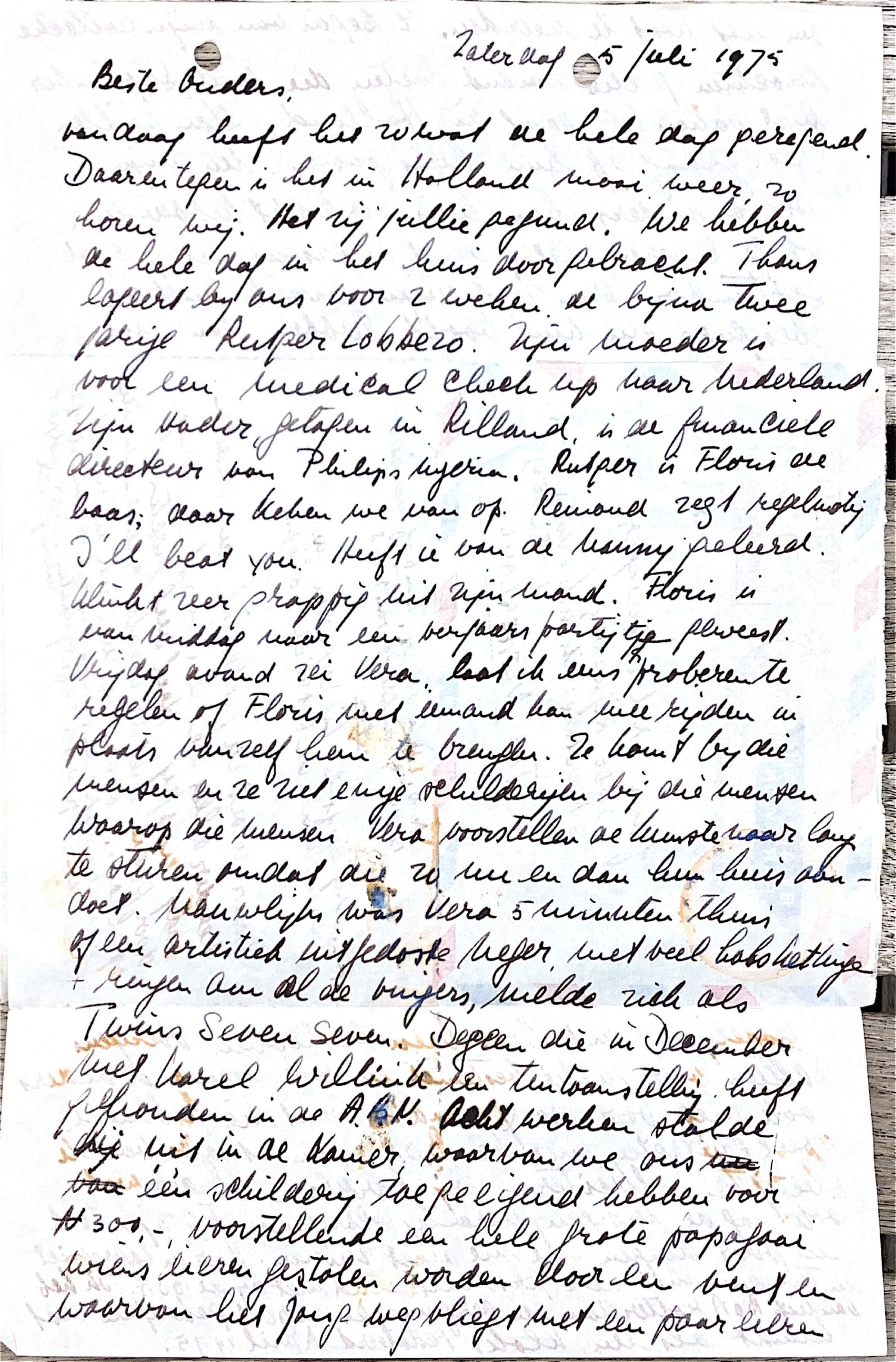 Overigens alleen voor jullie bestemd en voor niemand anders, ook niet voor de Ypma's want die hebben veel contacten met de BoA, vanuit Lagos ben ik bezig te solliciteren bij Barclay's. Verder wil ik nog de "Morgan Garanty-Bank" schrijven. Er zijn toch een paar dingen die mij niet zinnen: hier in Lagos niet en trouwens het hele personeelsbeleid niet bij de BoA. Ik heb van de BoA Rotterdam een "performance Report", gedateerd april 1975, gekregen dat klinkt als een klok. Daar moet ik gebruik van maken.