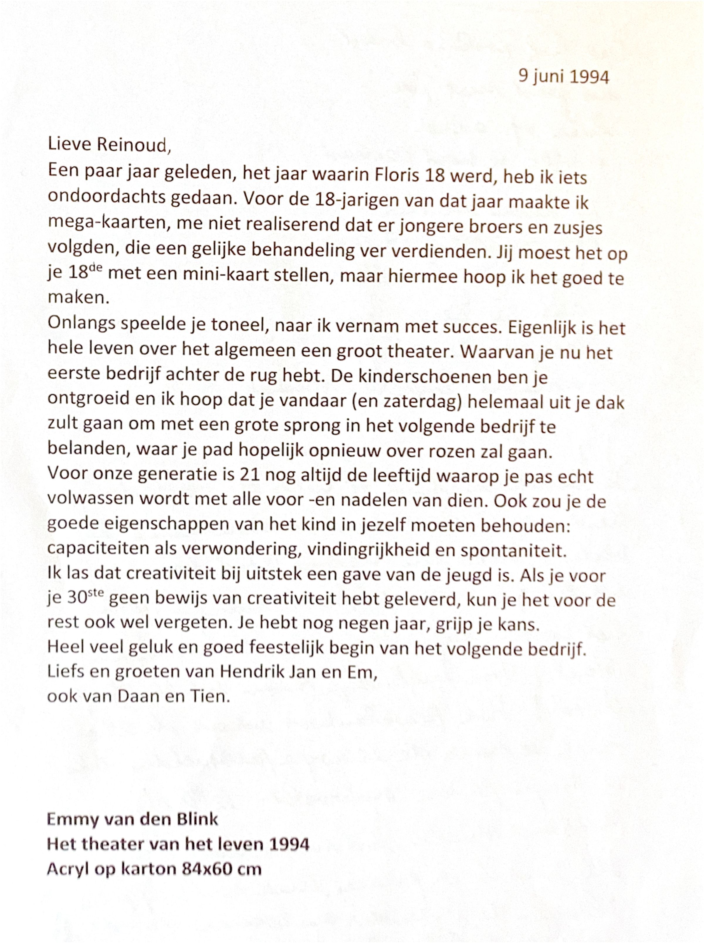 1994-06-09 Verjaardagsbrief van Emmy de Vries aan Reinoud bij haar mega-kaart.
