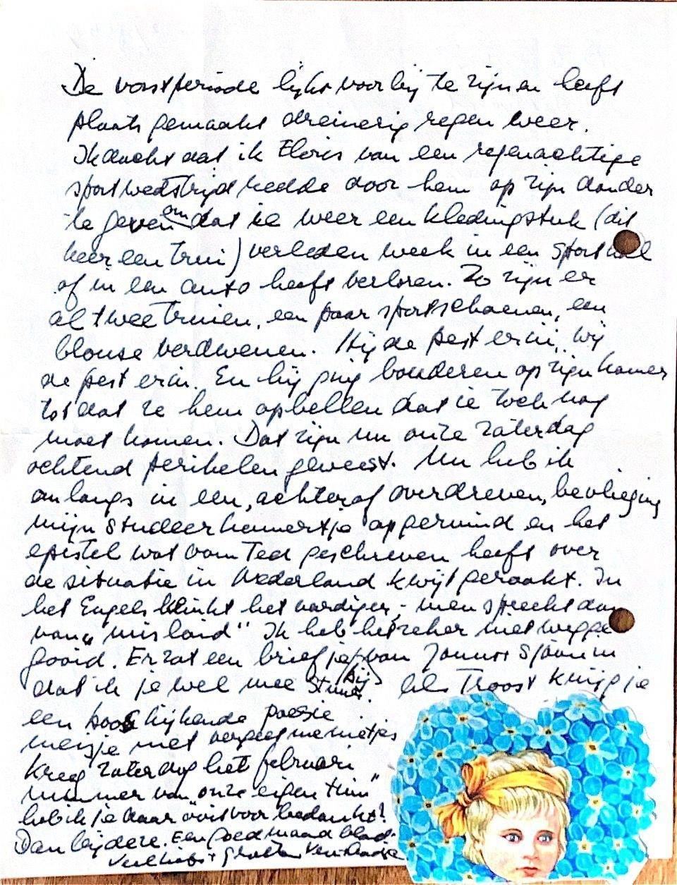 Nu heb ik onlangs, in een achteraf overdreven bevlieging, mijn studeerkamertje opgeruimd en het epistel dat Oom Ted geschreven, heeft over de situatie inNederland, ben ik kwijt geraakt. In het Engels klinkt het aardiger; men verontschuldigt zich dan met: "I have it mislaid." ik heb het zeker niet weggegooid. Er zat een briefje bij van Janus & Sjaan dat ik je nu mee stuur. Als troost krijg je een boos-kijkend Poesie-meisje met 'vergeet me nietjes'.
