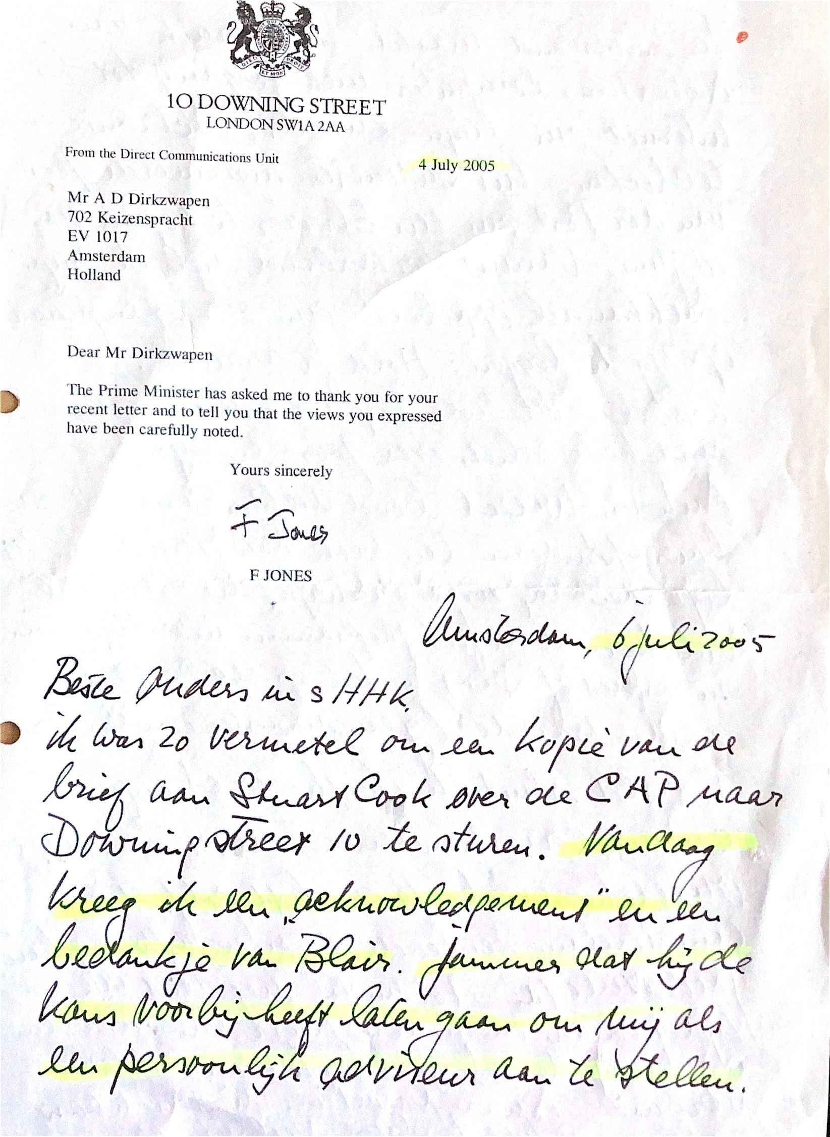 2005-07-06 Brief ADD uitKlosters aan Ouders over reactie van PM Blair..