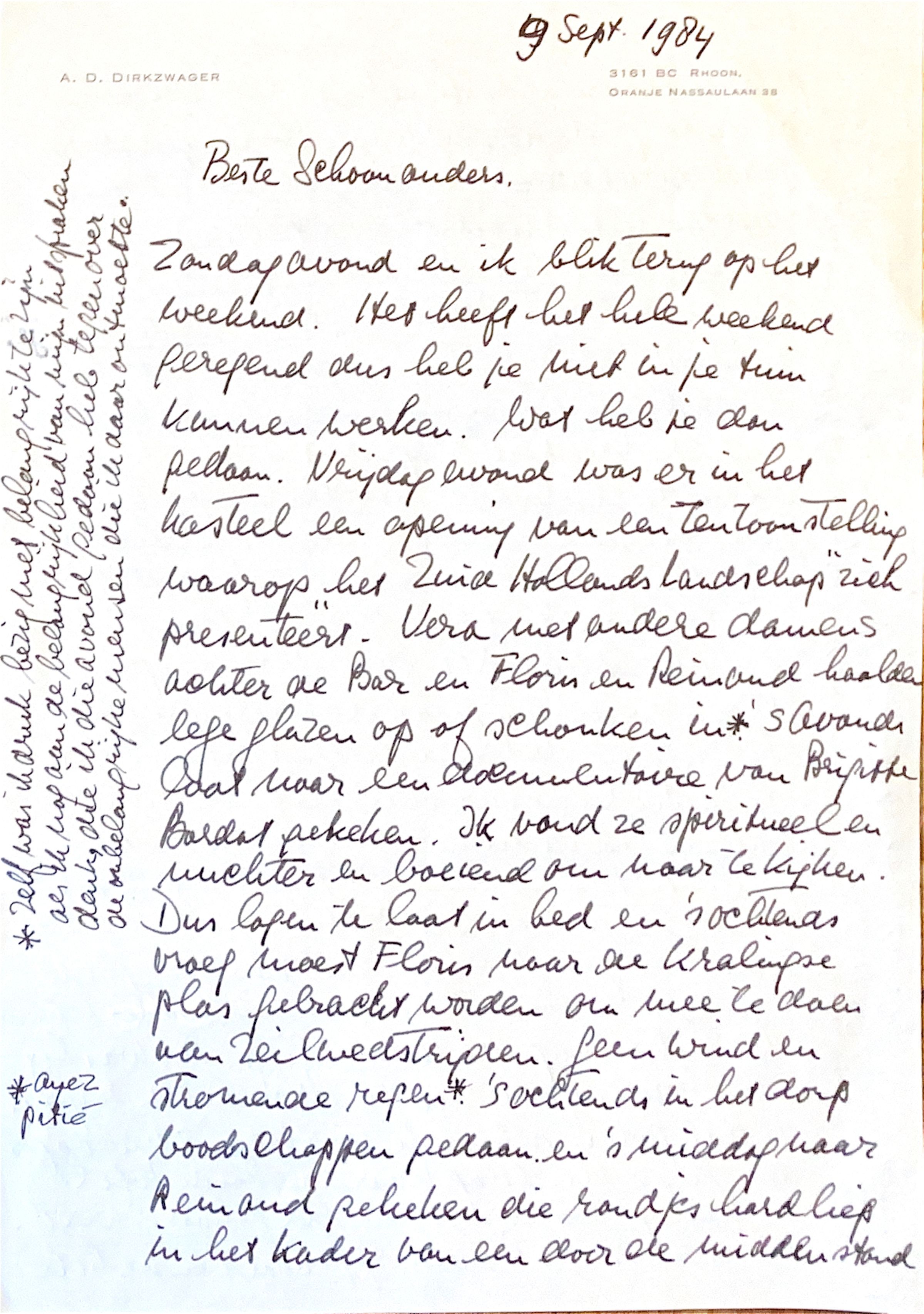 Als ik gepensioneerd ben, gaan we van de (grammofoon) platen genieten en het boek lezen, dat ik gekocht heb van het door u geschonken geldbedrag als het 1984 jaardagskado, Liefs Aadj