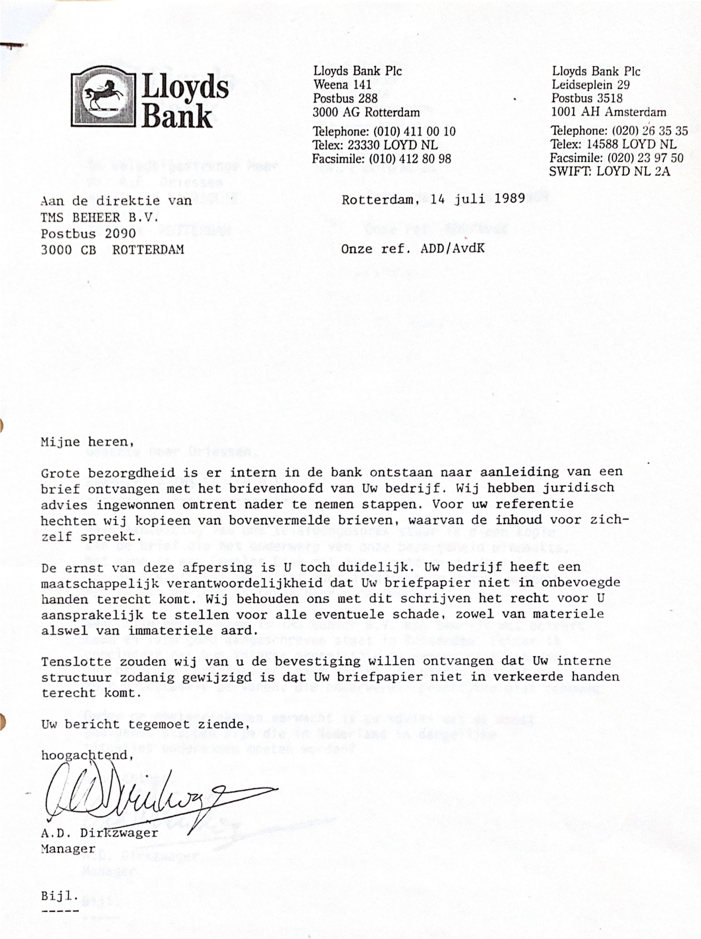 Tenslotte zouden wij van u bevestiging willen ontvangen dat uw interne structuur zodanig gewijzigd is dat Uw briefpapier niet in verkeerde handen terecht komt.