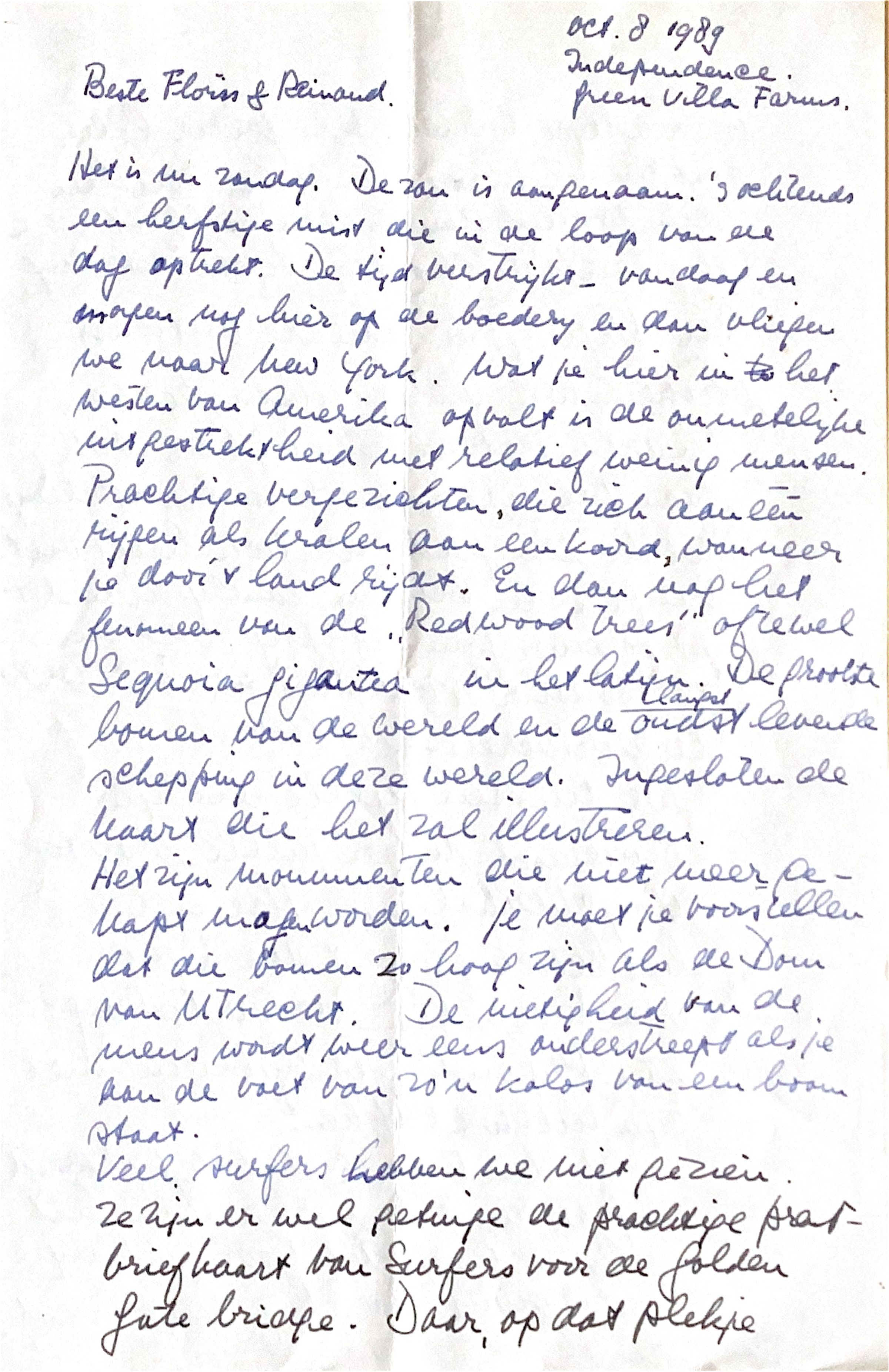 Het is nu zondag. De zon is aangenaam. 's-Ochtends een herfstige mist, dat in de loop van de dag wel zal optrekken. De tijd verstrijkt; vandaag en morgen nog hier op de boerderij en dan vliegen we naar New York. Wat je hier in het westen van Amerika opvalt, is de onmetelijke uitgestrektheid met relatief weinig mensen. Prachtige vergezichten, die zich aan één rijgen als kralen aan een koord, wanneer je door het land rijdt.