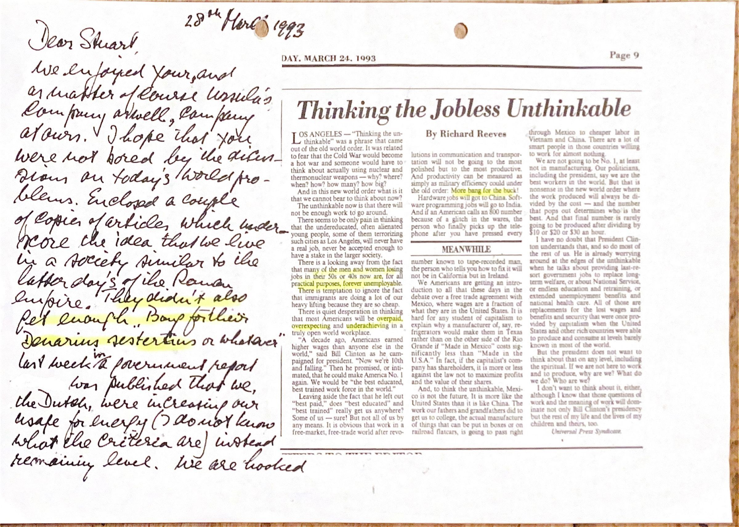 We enjoyed your company, and as a matter of course Ursula's company as well, at ours. I hope you did not find the discussions about current world problems boring