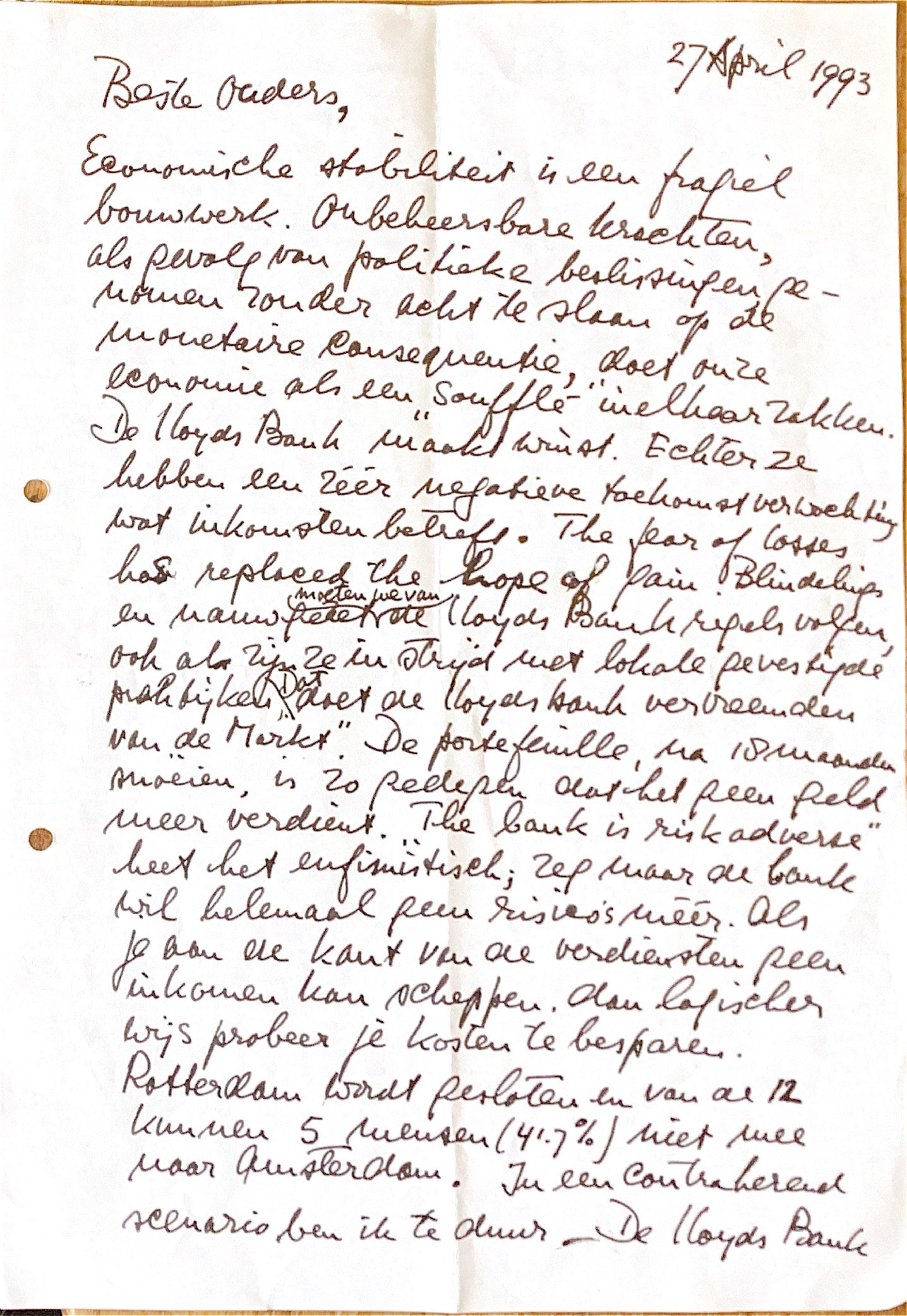 Onbeheersbare krachten, als gevolg van politieke beslissingen genomen zonder acht te slaan op de monetaire consequentie, doet onze economie als een "soufflé" in elkaar zakken. Echter de Bank heeft een zéér negatieve toekomstverwachting.wat inkomsten betreft. "The fear of losses has replaced the hope of gain." Blindelings en nauwgezet moeten we van de Lloyds Bank regels volgen, ook al zijn die in strijd met de lokale gevestigde praktijken. Dat doet de Lloyds Bank vervreemden van "de Markt." De portefeuille van Rotterdam Branch, na 18 maanden snoeien, is zo gedegen dat er geen geld mee te verdienen is. "The Bank is risk adverse heet het eufemistisch; zeg maar , de Bank wil helemaal geen risico's méér.