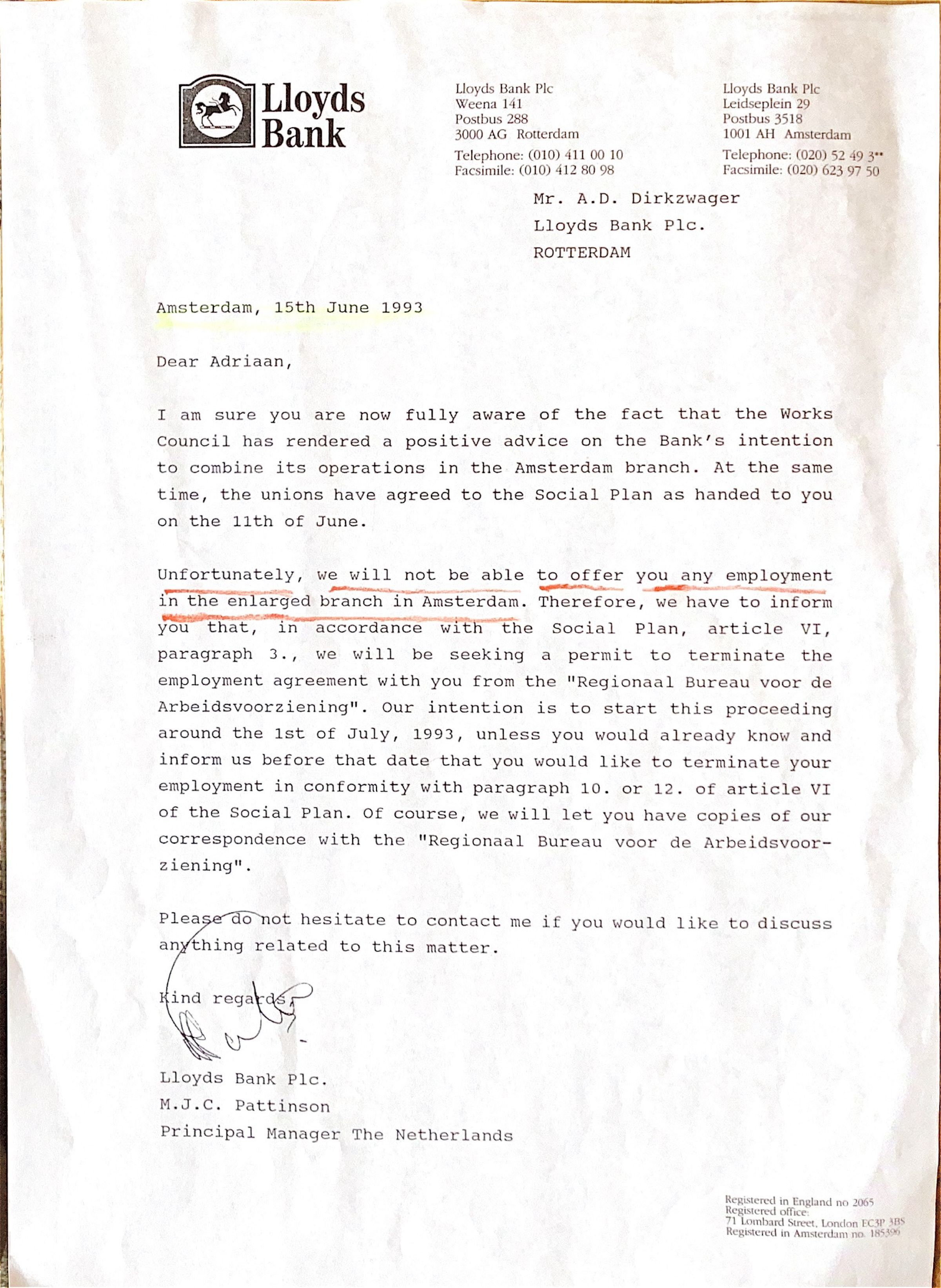 Unfortunately, we will not be able to offer you any employment in the enlarged branch in Amsterdam. Therefore, we have to inform you that in accordance with the Social Plan, article VI,