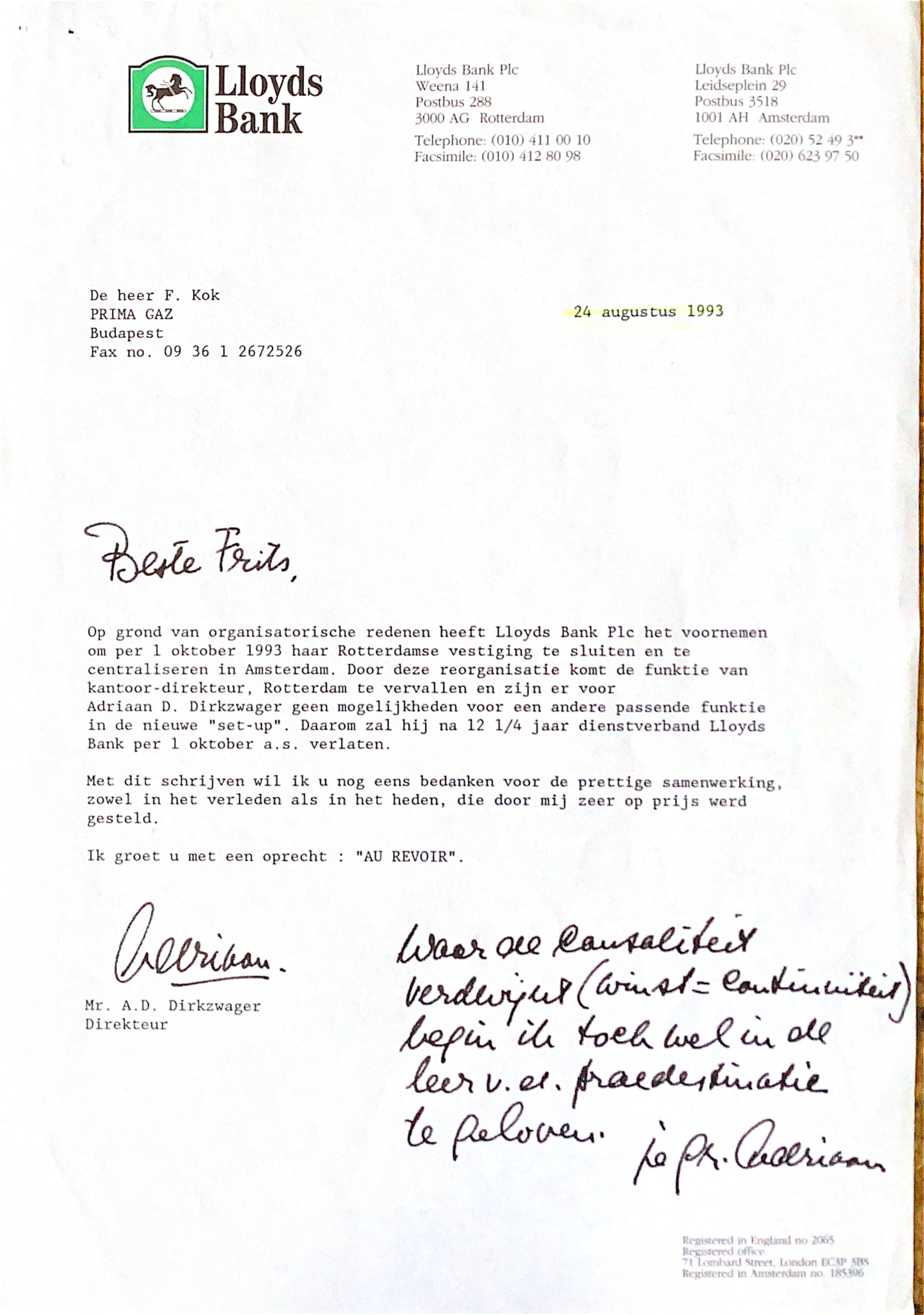 Daarom zal hij na 12,5 jaar dienstverband Lloyds Bank per 1 oktober a.s. verlaten. Met dit schrijven wil ik u nog eens bedanken voor de prettige samenwerking, zowel in het verleden als in het heden, die door nij zeerop prijs werd gesteld.