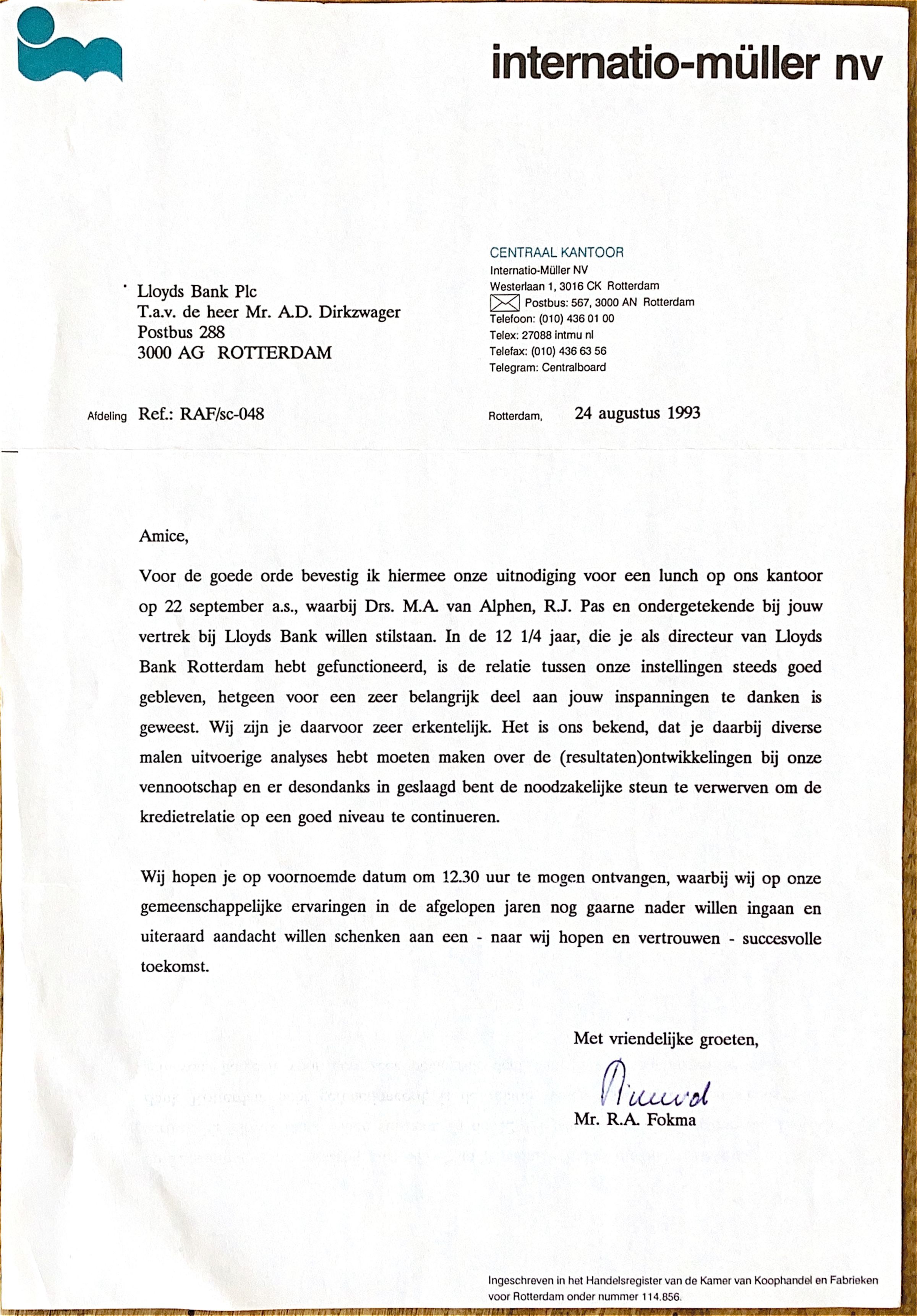 voor de goede orde bevestig ik hiermee onze uitnodiging voor een lunch op ons kantoor op 22 september a.s., waarbij Drs M.A. van Alphen, R.J. Pas en ondergetekende bij jouw vertrek willen stilstaan. In de 12 1/4 jaar, die je als directeur van Lloyds Bank Rotterdam hebt gefunctioneerd, is de relatie tussen onze instellingen steeds goed gebleven, hetgeen voor een zeer belangrijk deel aan jouw inspanningen te danken is geweest. Wij zijn je daarvoor zeer erkentelijk. Het is ons bekend, dat je daarbij diverse malen uitvoerige analyses hebt moeten. maken over de resultaten ontwikkelingen bij onze vennootschap en er desondanks in geslaagd bent de noodzakelijke steun te verwerven om de kredietrelatie op een goed niveau te continueren.