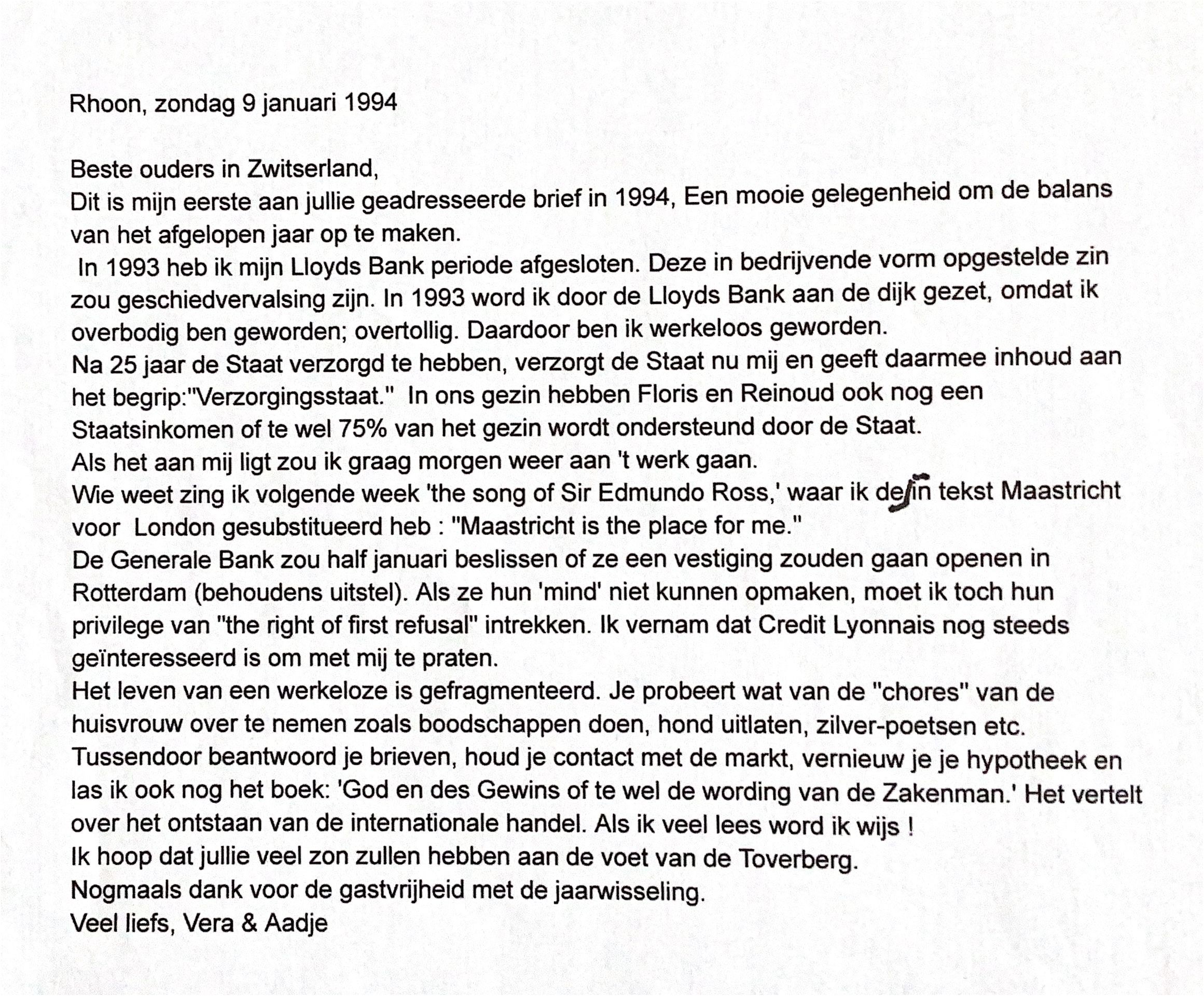 Als het aan mij ligt zou ik morgen weer aan het werk gaan. Wie weet zing ik volgende week "the song of Sir Edmundo Ross", waarin ik in de tekst 'Maastricht' voor 'London' heb gesubstitueerd." "Maastricht is the place for me." De Belgische Generale Bank zou half januari 1994 beslissen of zij een vestiging zouden gaan openen in Rotterdam (behoudens uitstel). Als zij hun "mind" niet kunnen opmaken, moet ik toch hun privilege van "the right of first refusal" intrekken. Ik vernam dat Credit Lyonnais nog steeds geïnteresseerd zijn om met mij te praten.