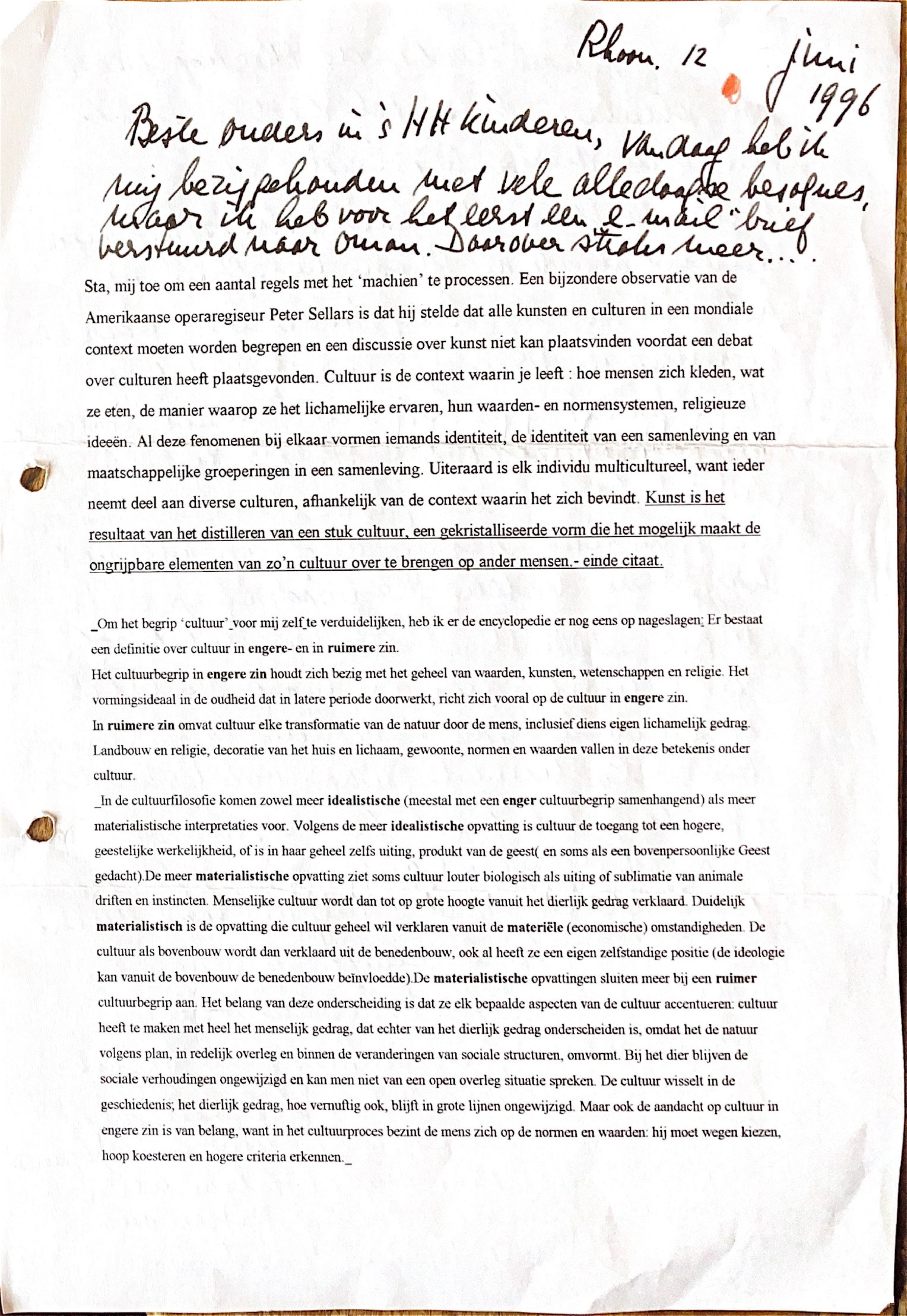 "en bijzondere observatie van de Amerikaanse opera-regiseur Peter Sellars is, dat hij stelde dat alle kunsten en culturen in een mondiale context moeten worden begrepen en een discussie over kunst niet kan plaatsvinden voordat een debat over culturen heeft plaatsgevonden. Cultuur is de context waarin je leeft; hoe mensen zich kleden, wat ze eten, de manier waarop ze het lichamelijke ervaren, hun waarden -en normensystemen, religieuze ideeën. Al deze fenomenen bij elkaar vormen iemands indentiteit, de identiteit van een samenleving en van maatschappelijke groeperingen. in een samenleving. Uiteraard is elk individu multicultureel, want ieder neemt deel aan diverse culturen, afhankelijk van de context waarin het zich bevindt. Kunst is het resultaat van het distilleren vanm een stuk cultuur, een gekristalliseerde vorm, die het mogelijk maakt de ongrijpbare elementen van zo'n cultuur over te brengen op ander mensen." einde citaat
