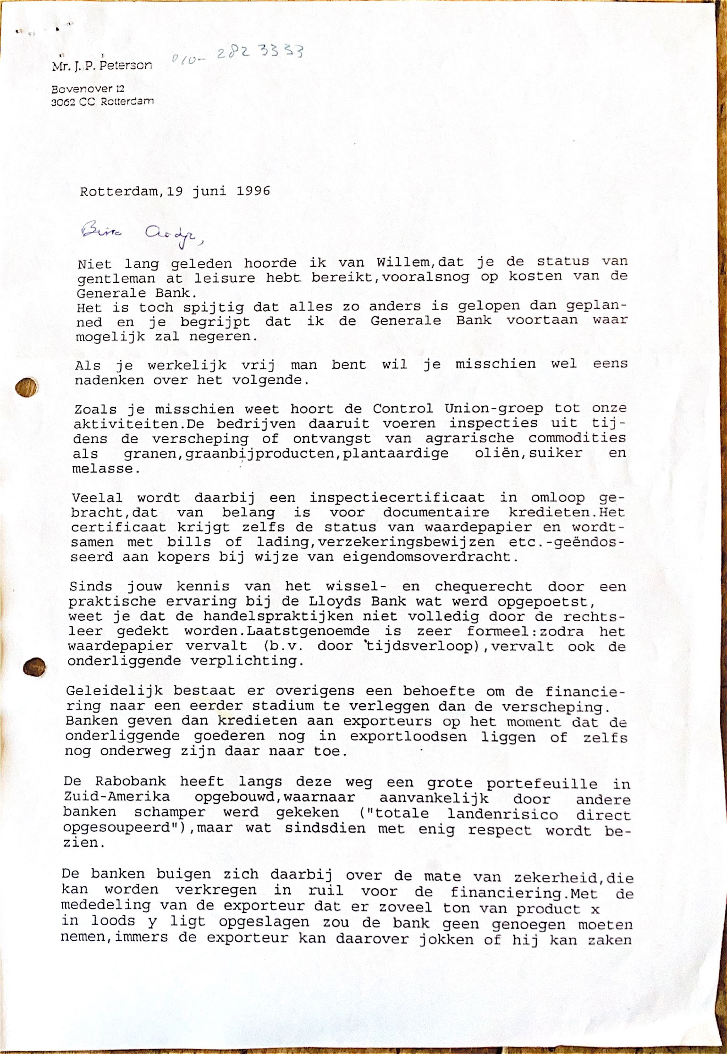 Niet lang geleden hoorde ik van Willem, dat je van status van "Gentleman of leisure"hebt bereikt, vooralsnog op kosten van de Generale Bank. Het is spijtig dat alles zo anders is gelopen dan gepland en je begrijpt dat ik de Generale Bank zal negeren.