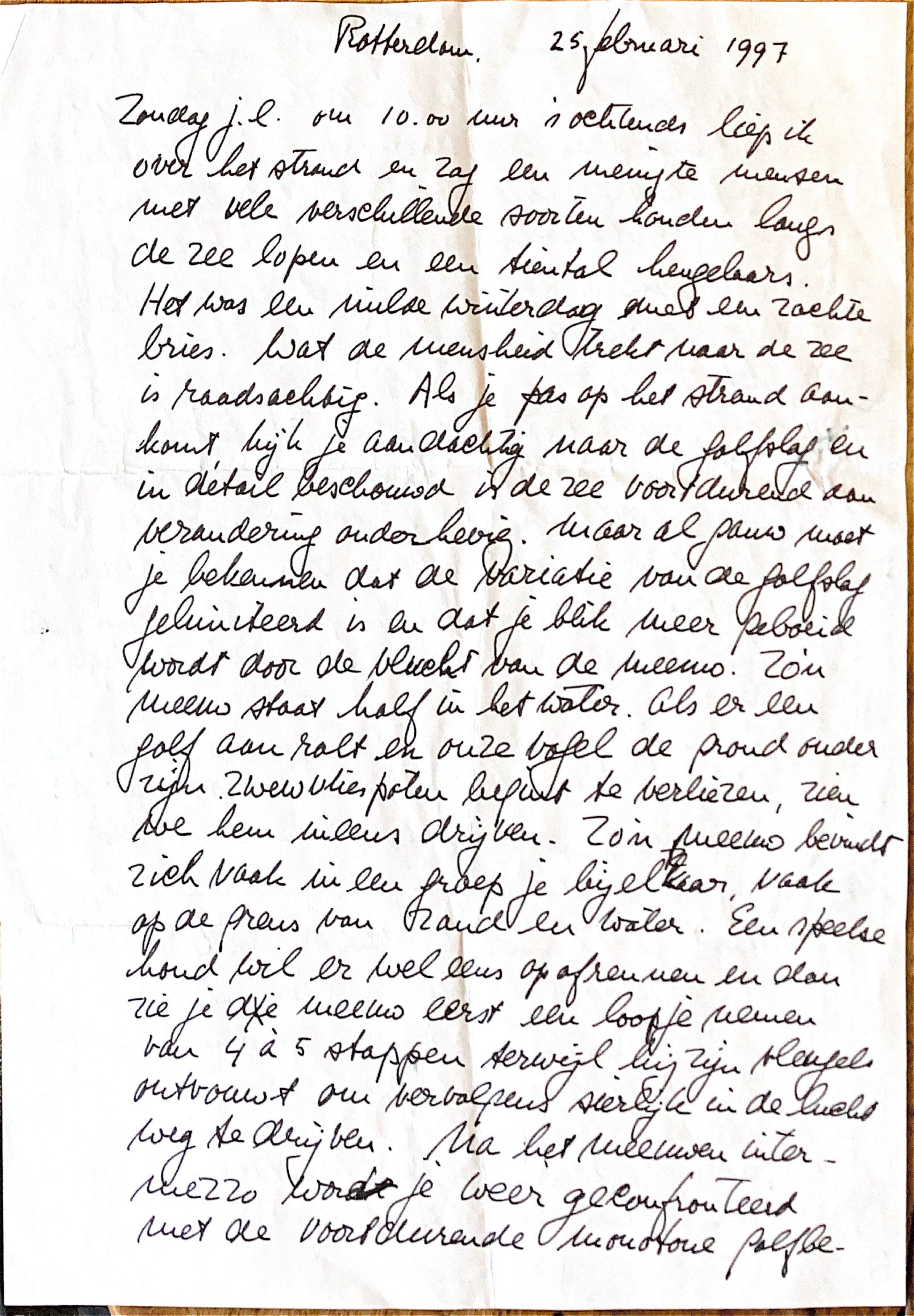 Zondag j.l. om 10.00 uur 's-ochtends liep ik over het strand en zag een menigte mensen met vele verschillende soorten honden langs de zee lopen en een tiental hengelaars. Wat de mensheid naar de zee trekt is raadselachtig. Als je pas op het strand aankomt, kijk je aandachtig naar de golfslag en in detail beschouwd, is de zee voortdurend aan verandering onderhevig. Maar al gauw moet je bekennen dat de variatie van de golfslag gelimiteerd is en dat je blik meer geboeid wordt de vlucht van de meeuw.