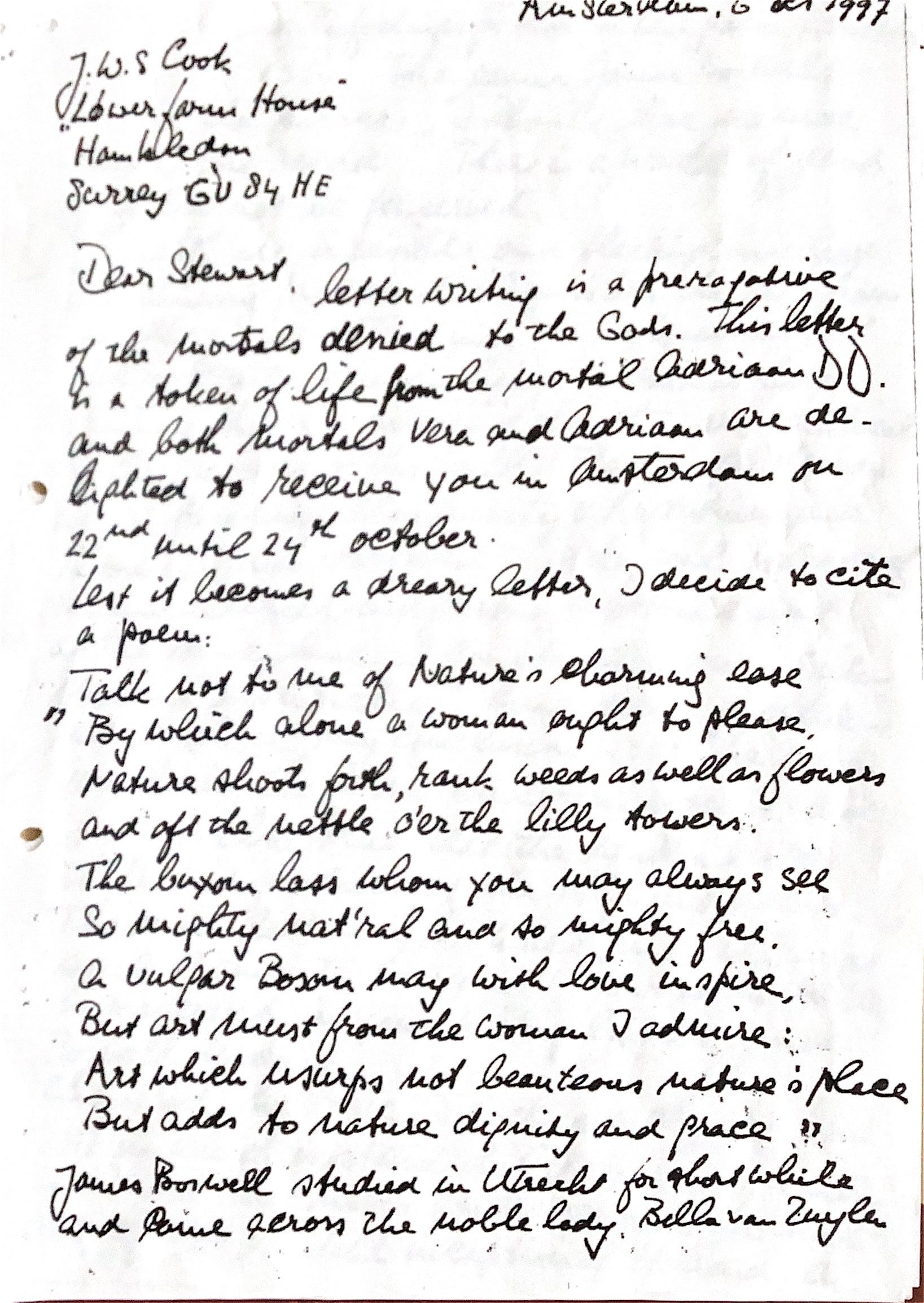 Letter writing is a prerogative of the mortals denied to the Gods This letter is a token of life from the mortal Adriaan DD. Both mortals Vera and Adriaan are delighted to receive you in Amsterdam on 22nd till 24th October.
