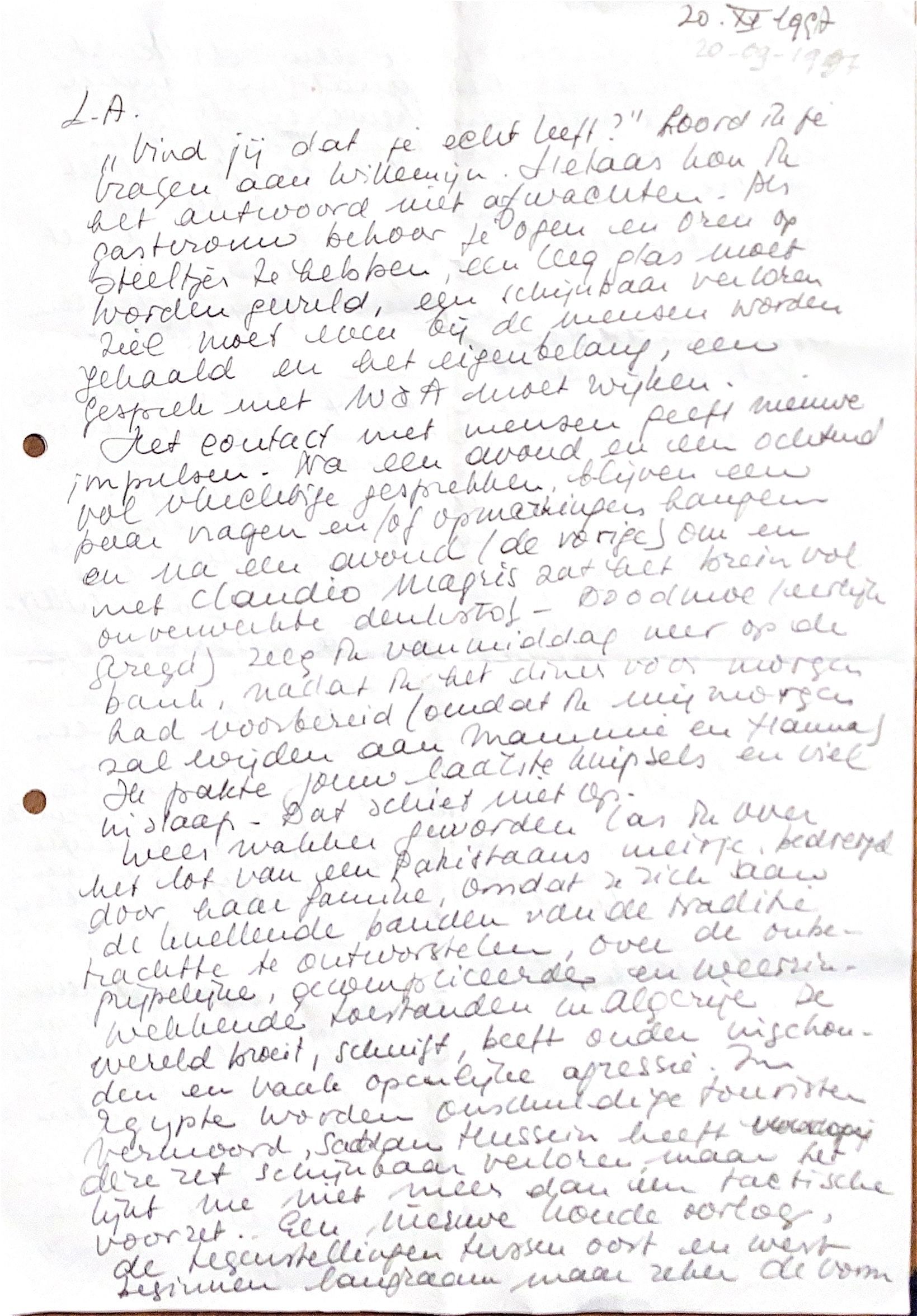 Het contact met mensen geeft nieuwe impulsen. Na een avond en een ochtend vol vluchtige gesprekken blijven een paar vragen en/of opmerkingen hangen en na een avond (de vorige) om Claudio Magris te citeren , zat het brein vol onverwerkte denkstof, doodmoe (eerlijk gezegd) zeeg ik vanmiddag neer op de bank, nadat ik het diner voor morgen had voorbereid (omdat ik mij morgen zal wijden aan Mammie en Hanna). Ik pakte jouw laatste knipsels en viel in slaap. Dat schiet niet op. Weer wakker geworden, las ik over het lot van een Pakistaans meisje, bedreigt door haar familie, omdat ze zich aan de knellende banden van de onbegrijpelijke, gecompliceerde en weerzinwekkende traditie in Algerije trachtte te ontworstelen. De wereld broeit, schuift, beeft onder ingehouden -en vaak openlijke agressie. In Egypte worden onschuldige toeristen vermoord; Saddam Hussein heeft deze zet schijnbaar verloren, maar het lijkt me niet meer dan een tactische voorzet. Een nieuwe koude oorlog, de tegenstellingen tussen Oost en West beginnen langzaam maar zeker de vorm aan te nemen van een godsdienstoorlog met al het fanatisme van-dien. Een beide partijen beweren de vrede na te streven.