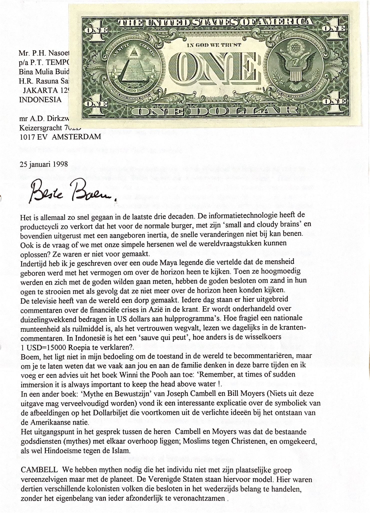 Ieder dag staan er hier uitgebreide commentaren over de financiële crises in Azië in de krant. Er wordt onderhandeld over duizelingwekkende bedragen in US dollars aan hulpprogramma's. Hoe fragiel een nationale munteenheid als ruilmiddel is, als het vertrouwen wegvalt, lezen we dagelijks in de krantencommentaren. In Indonesië is het 'sauve qui peut," hoe anders is de wisselkoers 1USD = 15000 Roepi te verklaren?