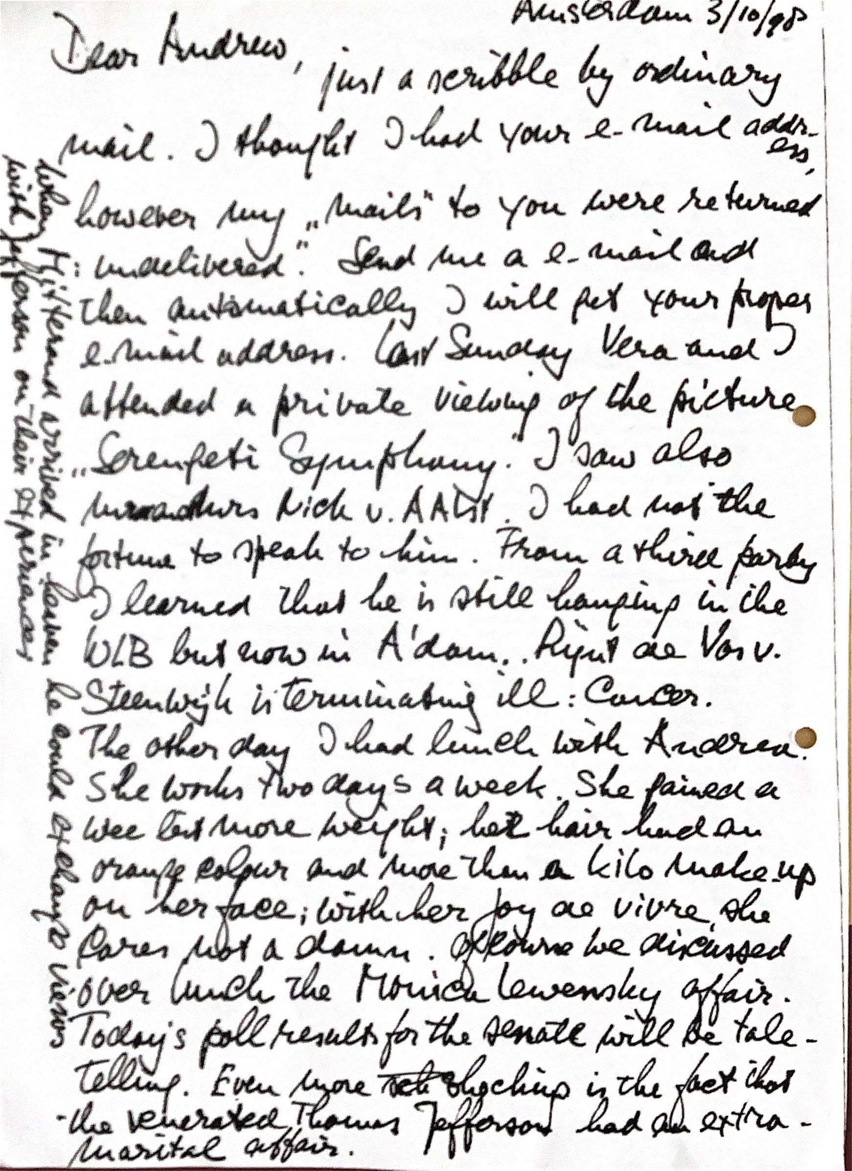 The other day I had a lunch with Andrea (former secretary at the Lloyds Bank Rotterdam) . She works two days a week. She gained a little weight; her hair is orange in color and there is over a pound of makeup on her face. With her "joy de vivre", she doesn't care. Of course we discussed the Monica Lewinsky affair with the US President Bill Clinton.