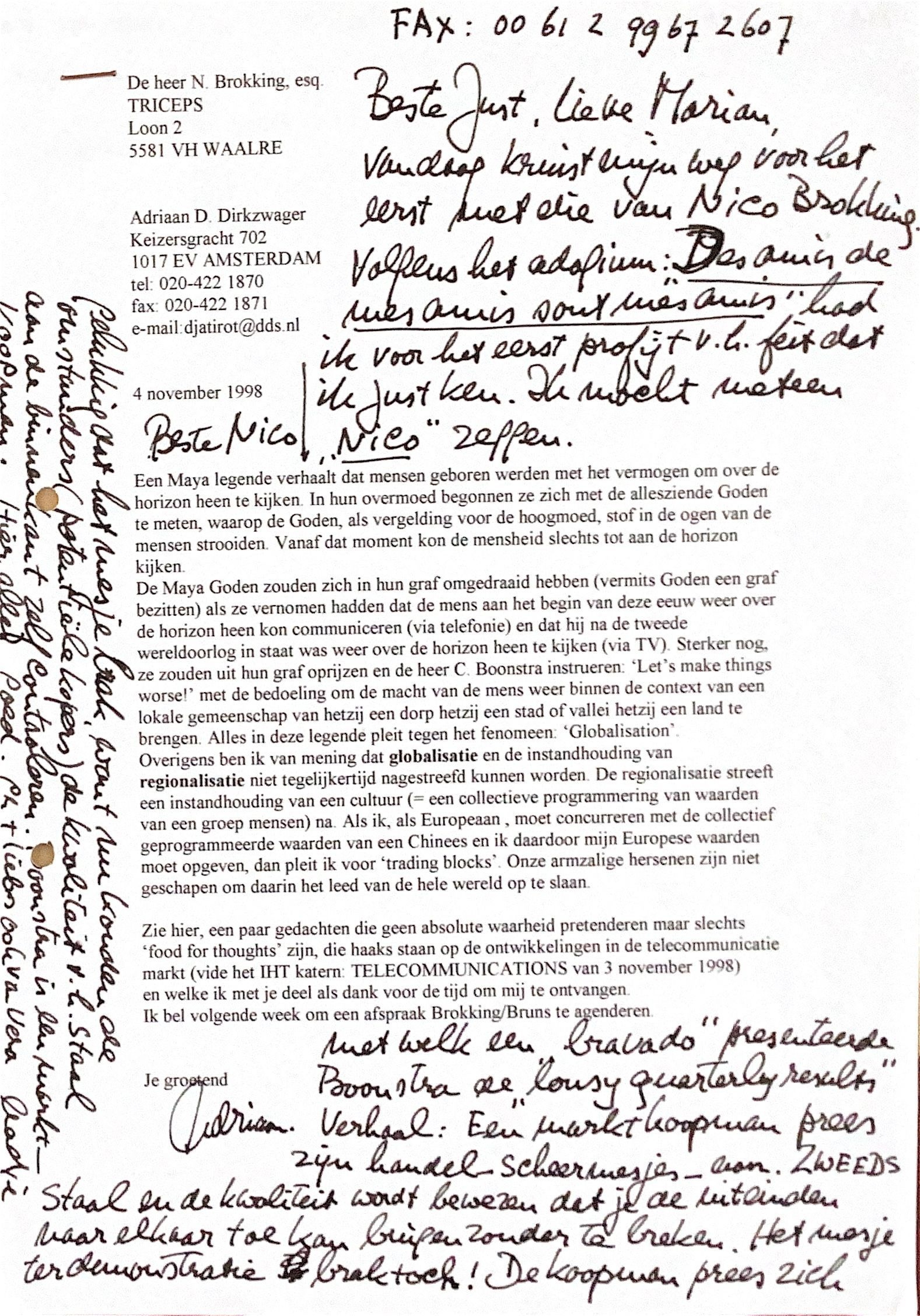 Kopie van de brief d.d. 4 nov. 1998 aan Nico Brokking (Oud Philips raad van bestuur) voor Just Veneklaas in Australië, voorheen Philips direkteur, Australië