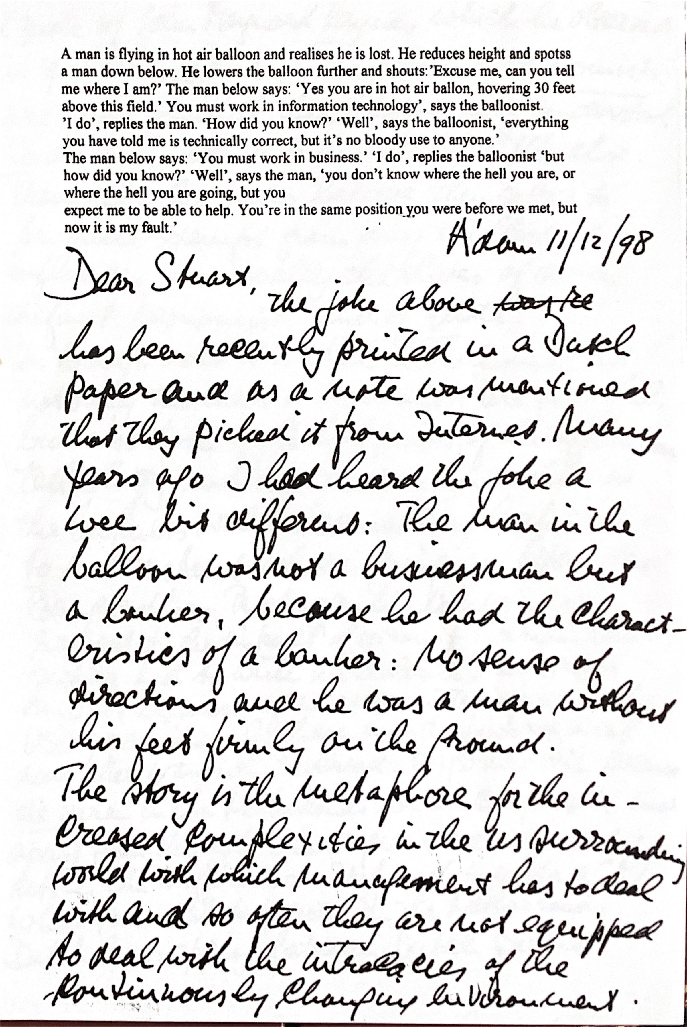 The above joke recently appeared in a Dutch magazine and a note stated that it was taken from the internet. Years ago I heard the joke slightly differently: the man in the balloon was not a businessman but a banker, because he had the characteristics of a banker: no sense of direction and he was a man whose feet were not firmly on the ground. The story is a metaphor for the increased complexity in our lives,