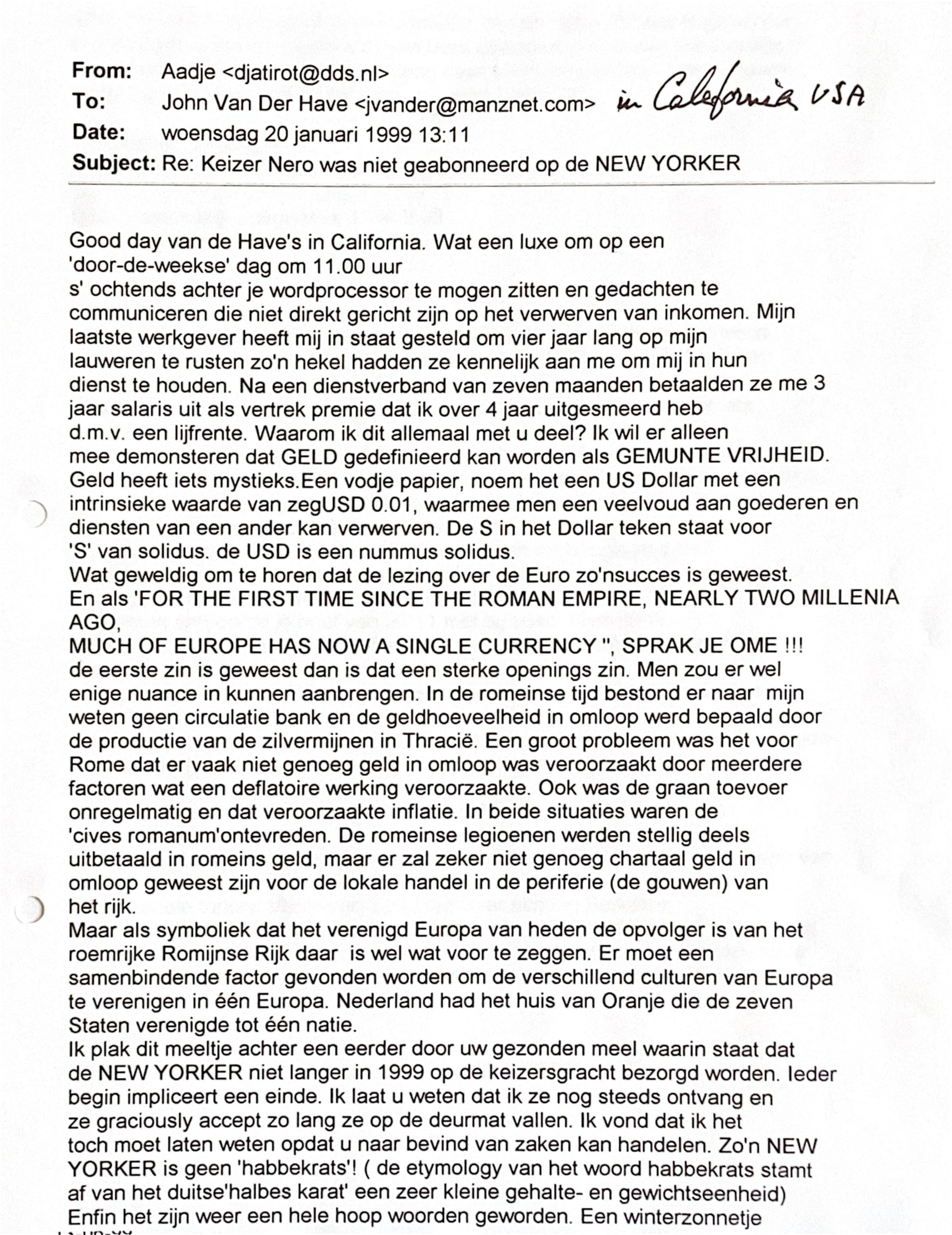 Ik plak achter deze mail uw mail, waarin u laat weten dat de NEW YORKER niet meer langer meer op de Keizersgracht 702 bezorgd zal worden. Ieder begin impliceert een einde. Ik lata u weten dat ik het magazine nog steeds ontvang en die "graciously accept" zolang die op de deurmat vallen. Ik vond dat ik U het moest laten weten, opdat U naar bevind van zaken kan handelen. De waarde van zo'n NEW YORKER is geen habbekrats.(de etmology van 'habbekrats' verwijst naar het Duitse "halbes Karats')