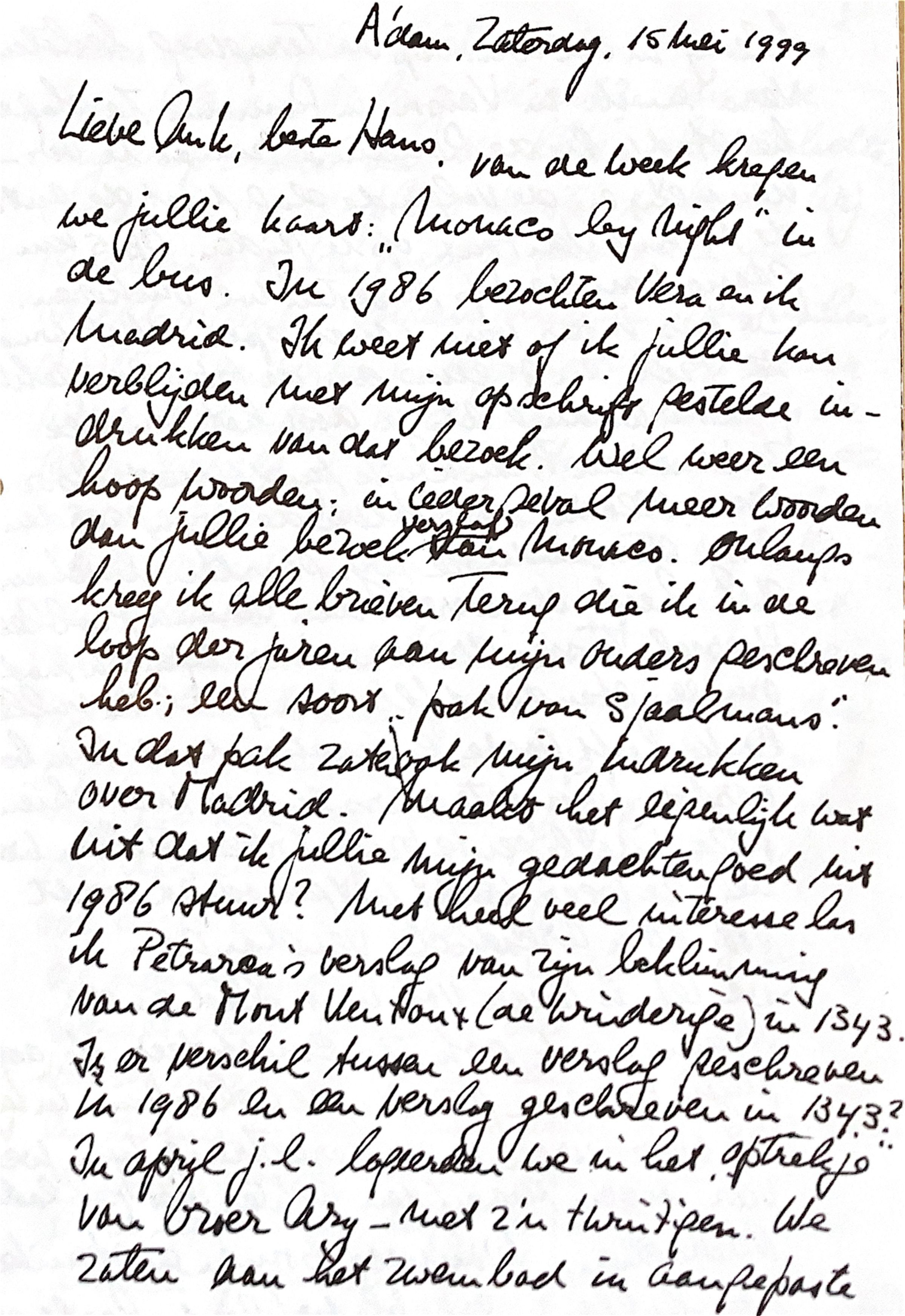 Onlangs kreeg ik alle brieven terug, die ik in de loop van jaren aan mijn ouders geschreven had; een soort "Pak van Sjaalmans." Dat "Pak"bevatte ook mijn indrukken van het ons verblijf in Madrid. Maakt het eigenlijk wat uit dat ik jullie mijn gedachten uit 1986 stuur?