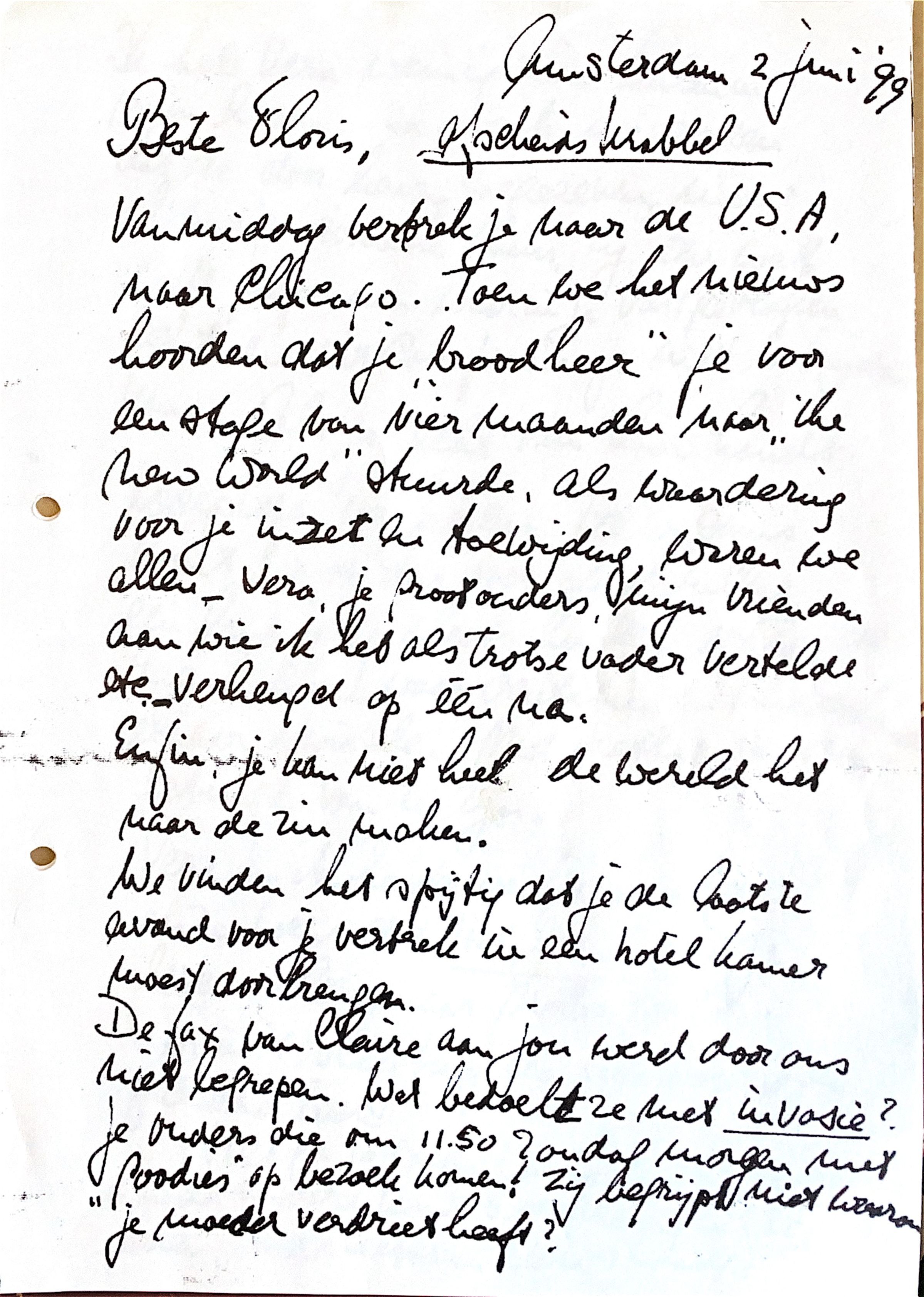 Vanmiddag vertrek je naar de USA. naar Chicago. Toen we het nieuws hoorden, dat je "broodheer" je voor een stage van vier maanden naar "the New World" stuurde, als waardering en toewijding, waren wij allen, i.e. Vera, je grootouders, mijn vrienden, aan wie ik het als trotse vader verteld etc, verheugd op één na.